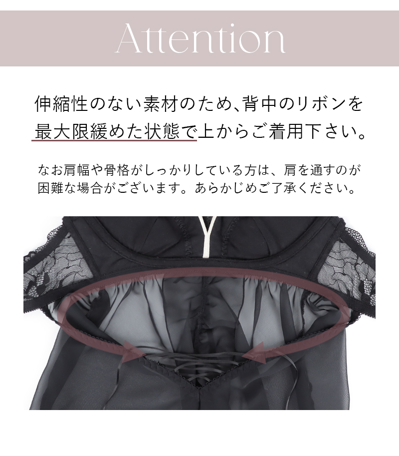 ※伸縮性のない素材のため、背中のリボンを最大限緩めた状態で上からご着用下さい。 なお肩幅や骨格がしっかりしている方は、肩を通すのが困難な場合がございます。 予めご了承ください。