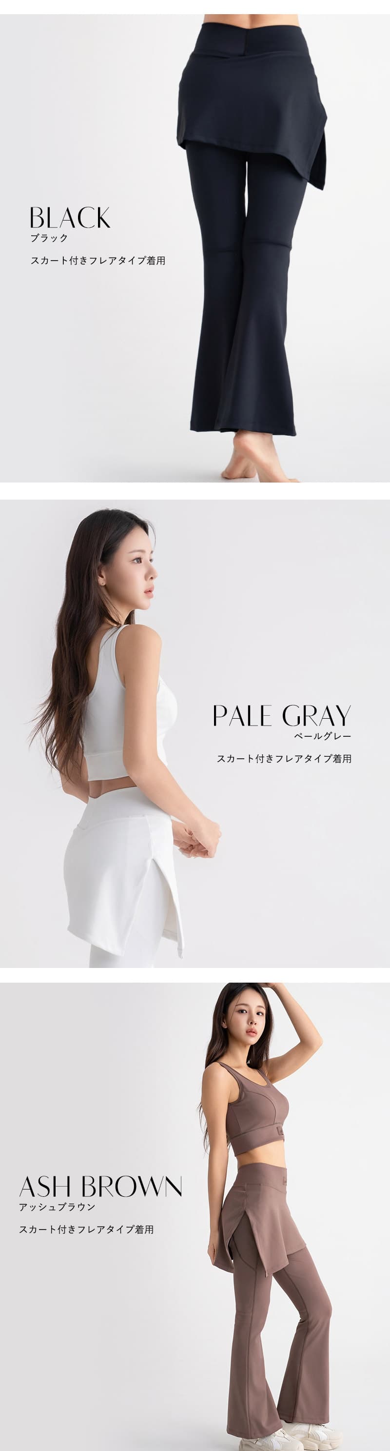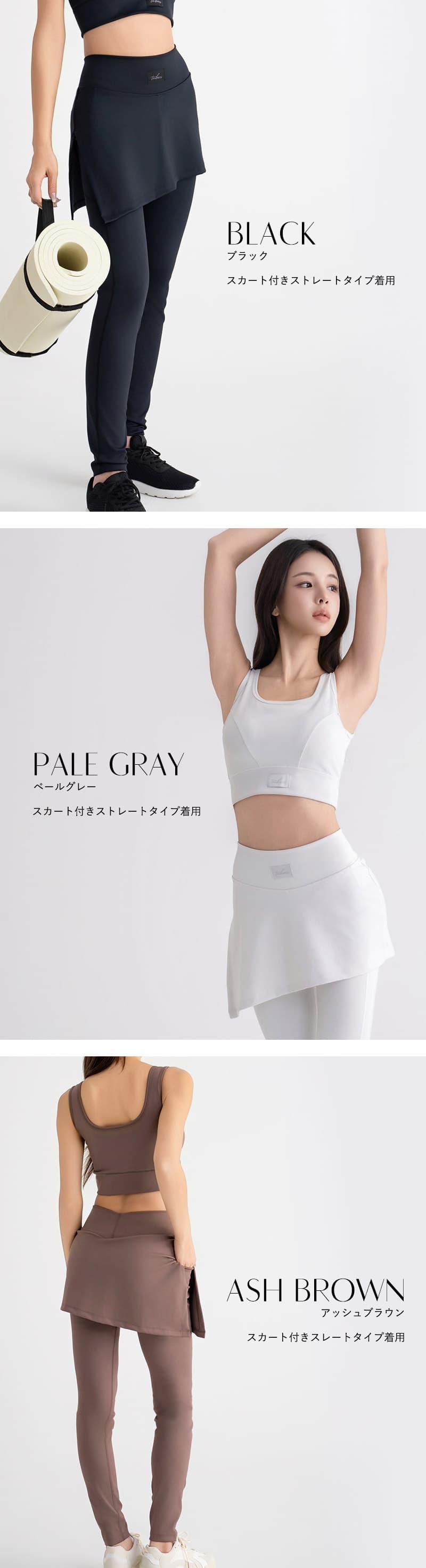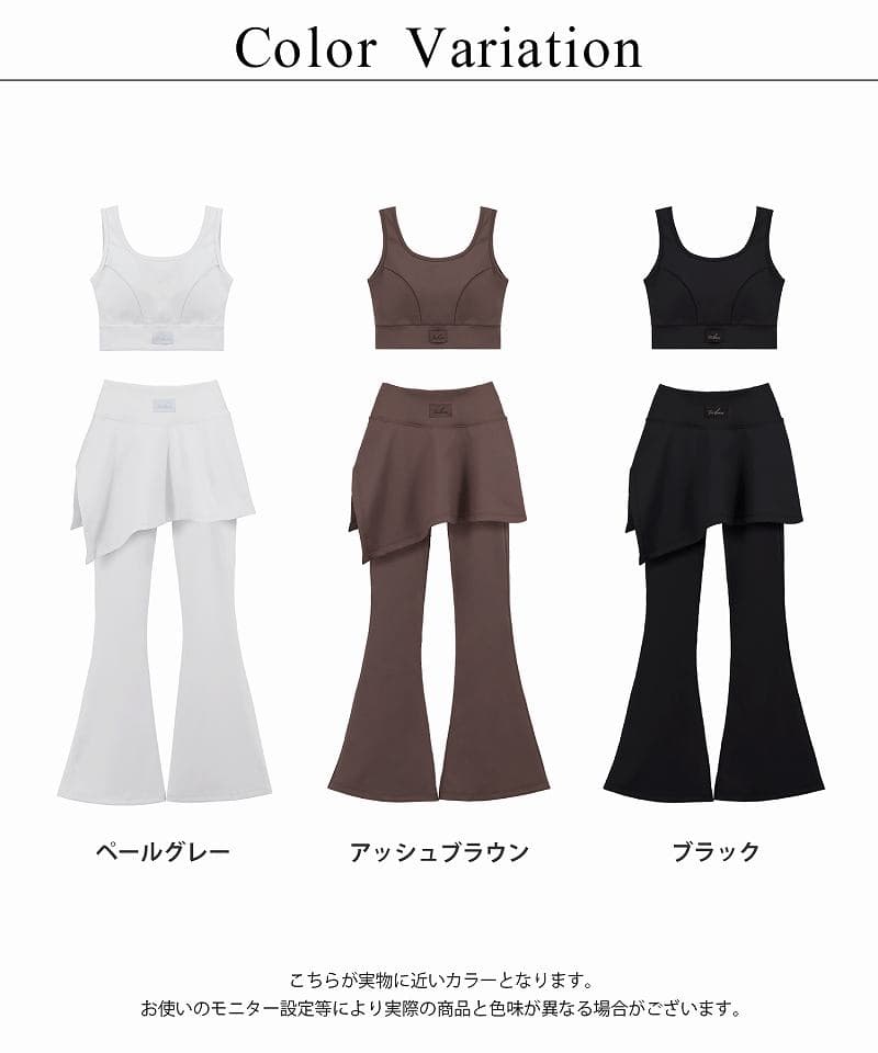 《スポーツブラ》 【S】前中心丈:約22.7cm、アンダー:約30cm 【M】前中心丈:約23.7cm、アンダー:約32cm 【L】前中心丈:約24.7cm、アンダー:約34cm 【XL】前中心丈:約25.7cm、アンダー:約36cm 《レギンス(ストレートスカート)》 【S】ウエスト:約31cm、総丈:約93cm、股下:約60.5cm、足口:約9.5cm 【M】ウエスト:約33cm、総丈:約95cm、股下:約61.5cm、足口:約10.5cm 【L】ウエスト:約35cm、総丈:約97cm、股下:約62.5cm、足口:約11.5cm 【XL】ウエスト:約37cm、総丈:約99cm、股下:約63.5cm、足口:約12.5cm 《レギンス(フレアスカート)》 【S】ウエスト:約31cm、総丈:約96cm、股下:約63.5cm、足口:約26.5cm 【M】ウエスト:約33cm、総丈:約98cm、股下:約64.5cm、足口:約27.5cm 【L】ウエスト:約37cm、総丈:約101cm、股下:約65.5cm、足口:約28.5cm 【XL】ウエスト:約35cm、総丈:約100cm、股下:約65.5cm、足口:約29.5cm ※平置きサイズはスタッフが採寸した実寸値となり、若干の誤差が生じる場合がございます。 ※パンツには伸縮性がございます。