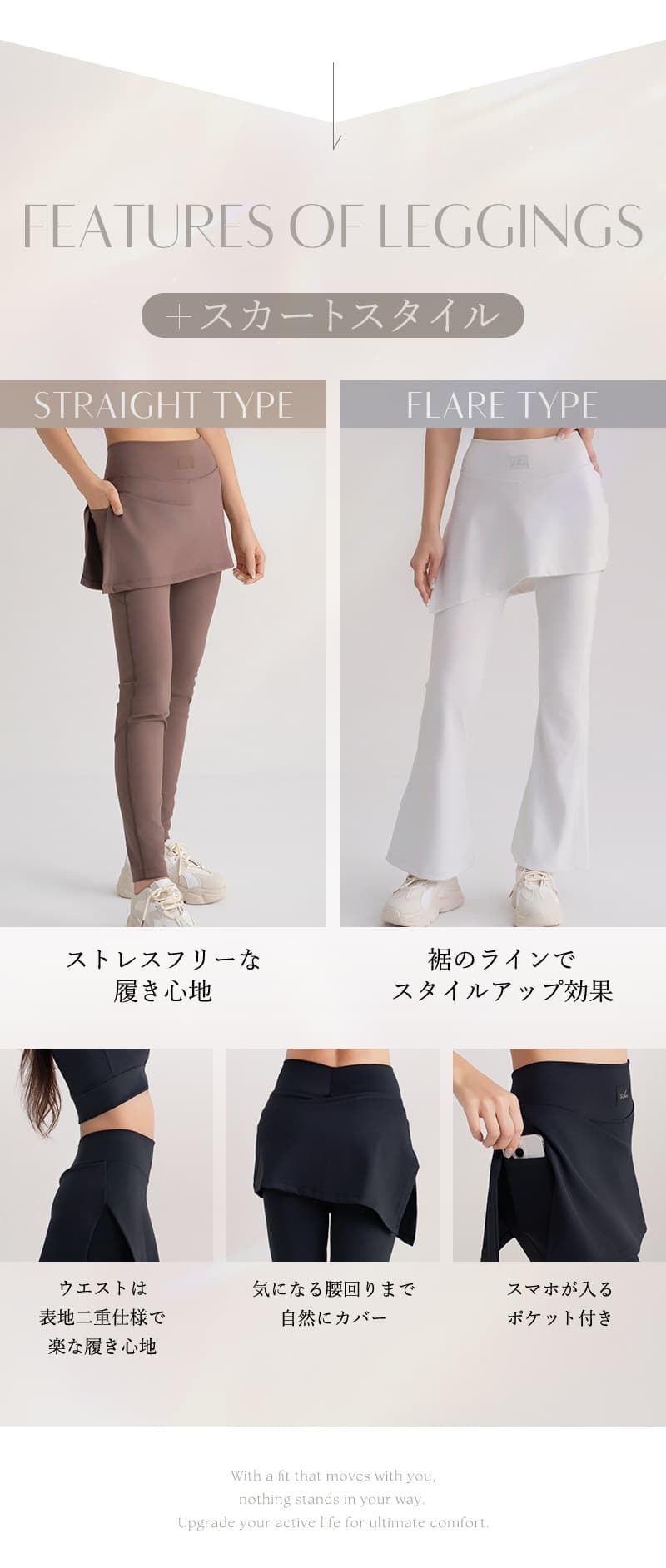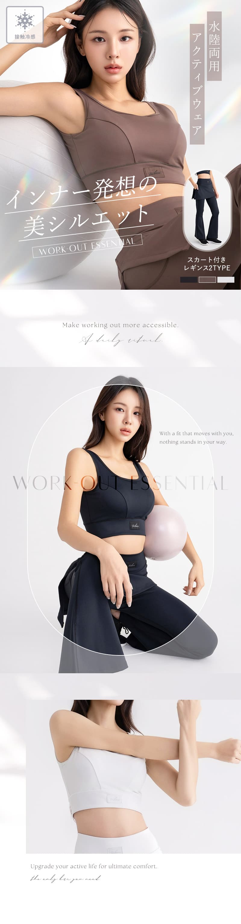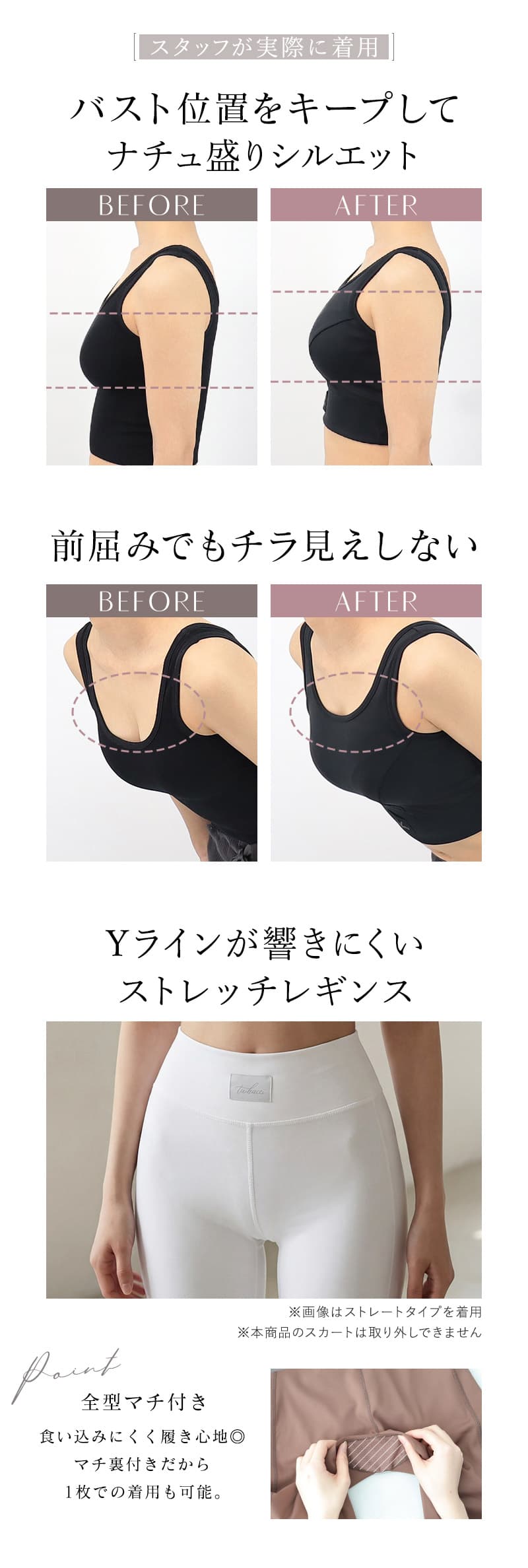 《スポーツブラ》 【S】前中心丈:約22.7cm、アンダー:約30cm 【M】前中心丈:約23.7cm、アンダー:約32cm 【L】前中心丈:約24.7cm、アンダー:約34cm 【XL】前中心丈:約25.7cm、アンダー:約36cm 《レギンス(ストレートスカート)》 【S】ウエスト:約31cm、総丈:約93cm、股下:約60.5cm、足口:約9.5cm 【M】ウエスト:約33cm、総丈:約95cm、股下:約61.5cm、足口:約10.5cm 【L】ウエスト:約35cm、総丈:約97cm、股下:約62.5cm、足口:約11.5cm 【XL】ウエスト:約37cm、総丈:約99cm、股下:約63.5cm、足口:約12.5cm 《レギンス(フレアスカート)》 【S】ウエスト:約31cm、総丈:約96cm、股下:約63.5cm、足口:約26.5cm 【M】ウエスト:約33cm、総丈:約98cm、股下:約64.5cm、足口:約27.5cm 【L】ウエスト:約37cm、総丈:約101cm、股下:約65.5cm、足口:約28.5cm 【XL】ウエスト:約35cm、総丈:約100cm、股下:約65.5cm、足口:約29.5cm ※平置きサイズはスタッフが採寸した実寸値となり、若干の誤差が生じる場合がございます。 ※パンツには伸縮性がございます。