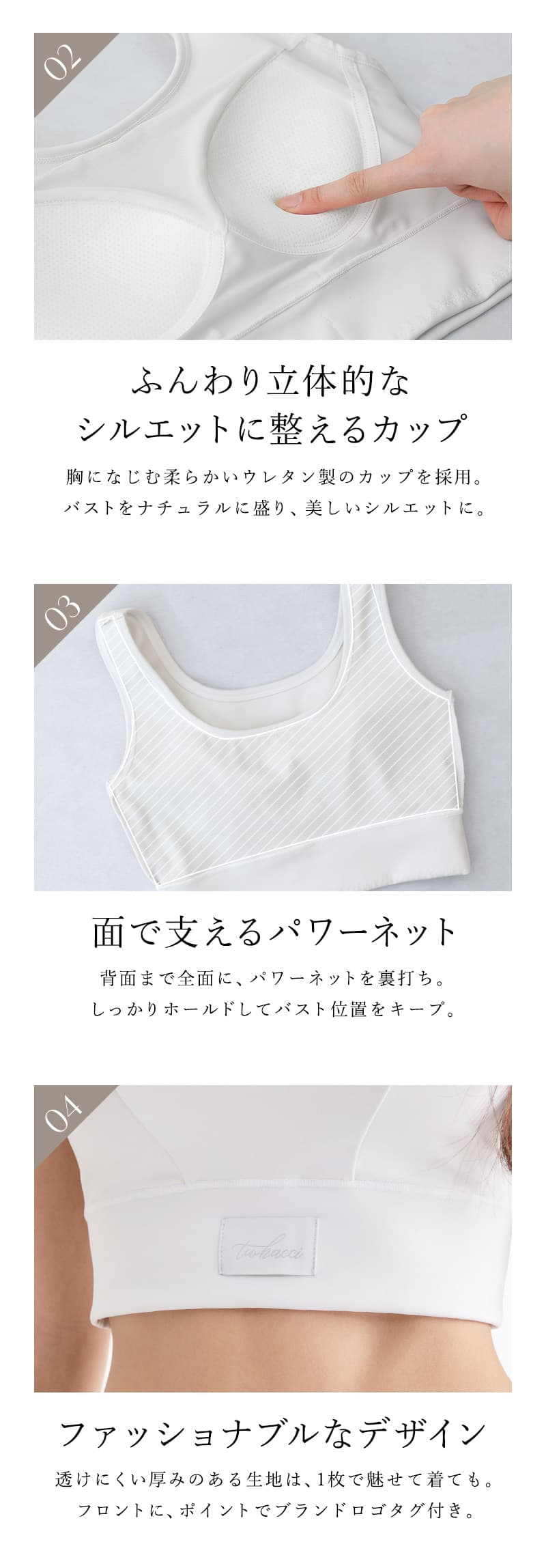 肩紐取り外し:不可 肩紐調節:不可 パッド:あり(取り外し不可) ワイヤー:なし ホック:なし