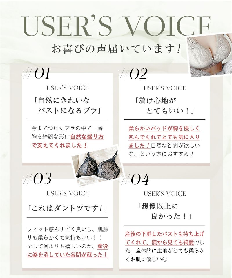 デザインがとても可愛く、ノンワイヤーだけどしっかり支えられている感じが気に入りました。 パットが想像以上に厚かったので、しっかり盛りたい人にはオススメです。 ブラ紐も外せるので、オフショルやドレスの時にも活躍しそうです!