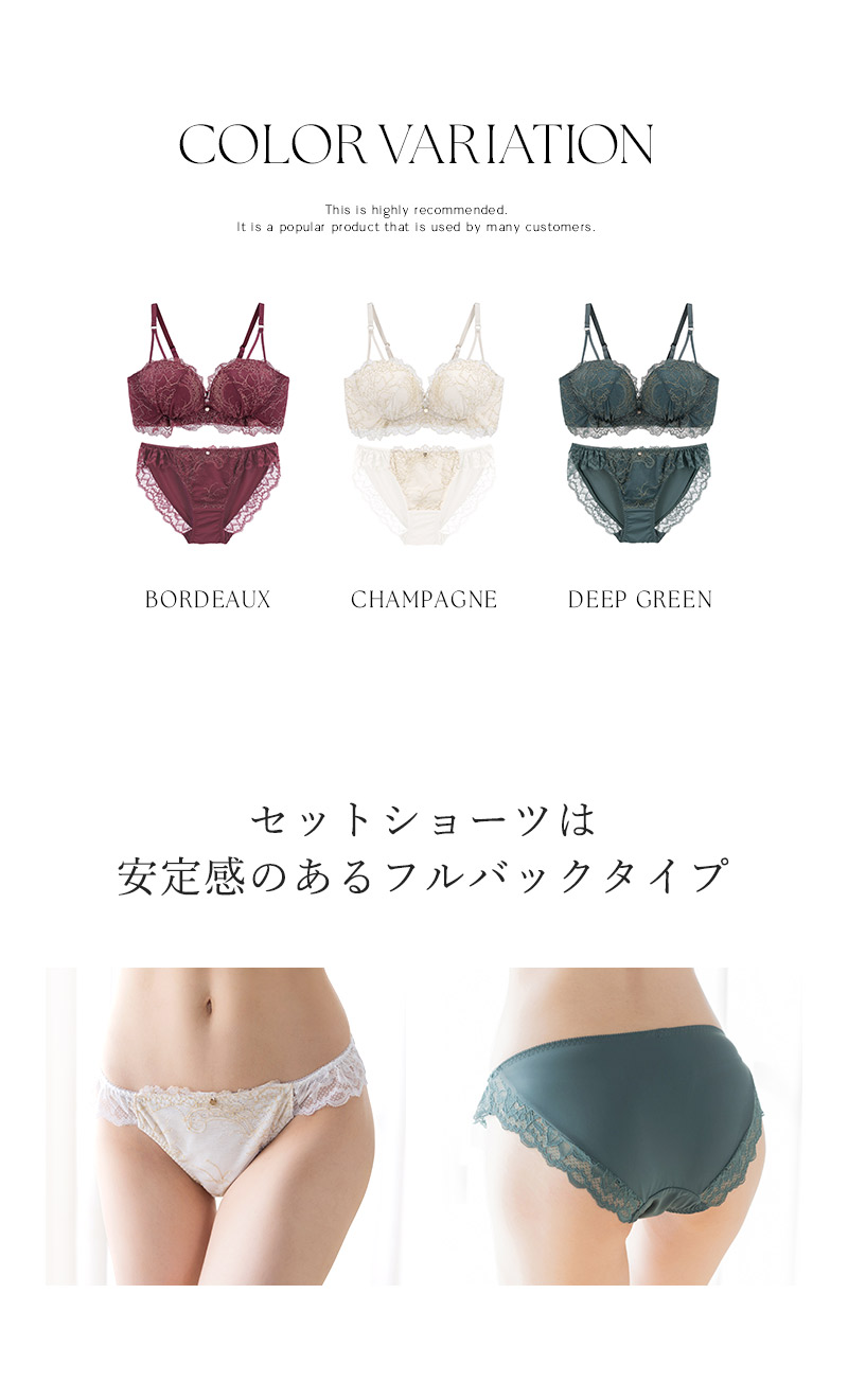 A70/ショーツM A75/ショーツM A75/ショーツL B65/ショーツM B70/ショーツM B75/ショーツM B75/ショーツL B80/ショーツL C65/ショーツM C70/ショーツM C75/ショーツM C75/ショーツL C80/ショーツL D65/ショーツM D70/ショーツM D75/ショーツM D75/ショーツL D80/ショーツL ※一部のカップでショーツサイズがお選びいただけます。 上記以外の組み合わせはお選びいただけませんのでご了承ください。
