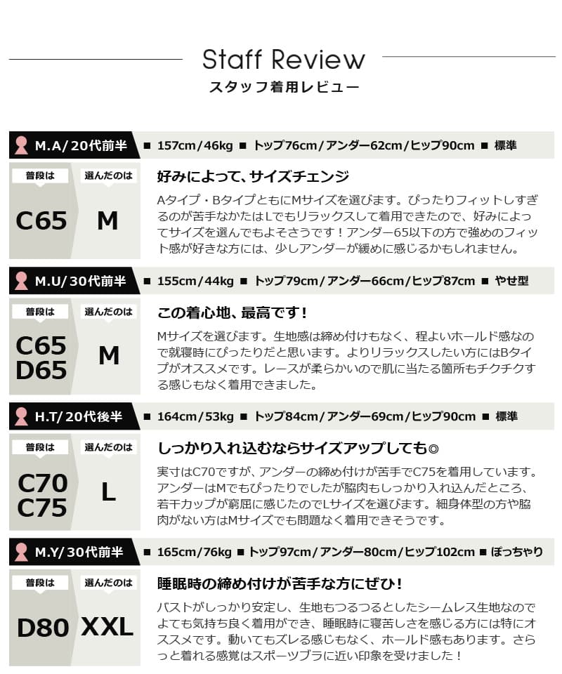 普段B80/C80 今回購入XL 骨格はストレート 身長170センチ体重77キロ 今まで買ったナイトブラは綿タイプのものでホックのないタイプでしたが、つけてる感や寝苦しさを感じてました。今回のものはホックがあり不安でしたが、素材もサラサラしていてホックも気になりませんでした。つけている感じもあまりなくとても良かったです。