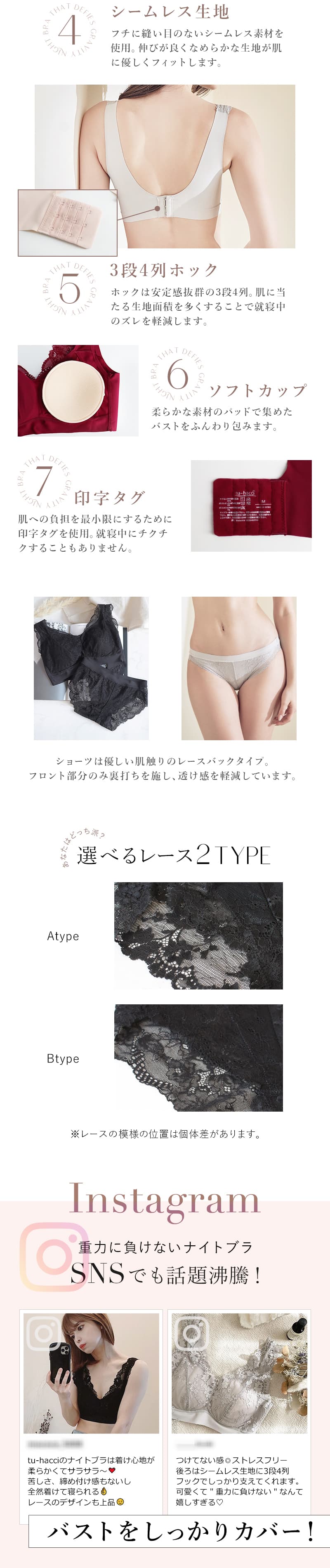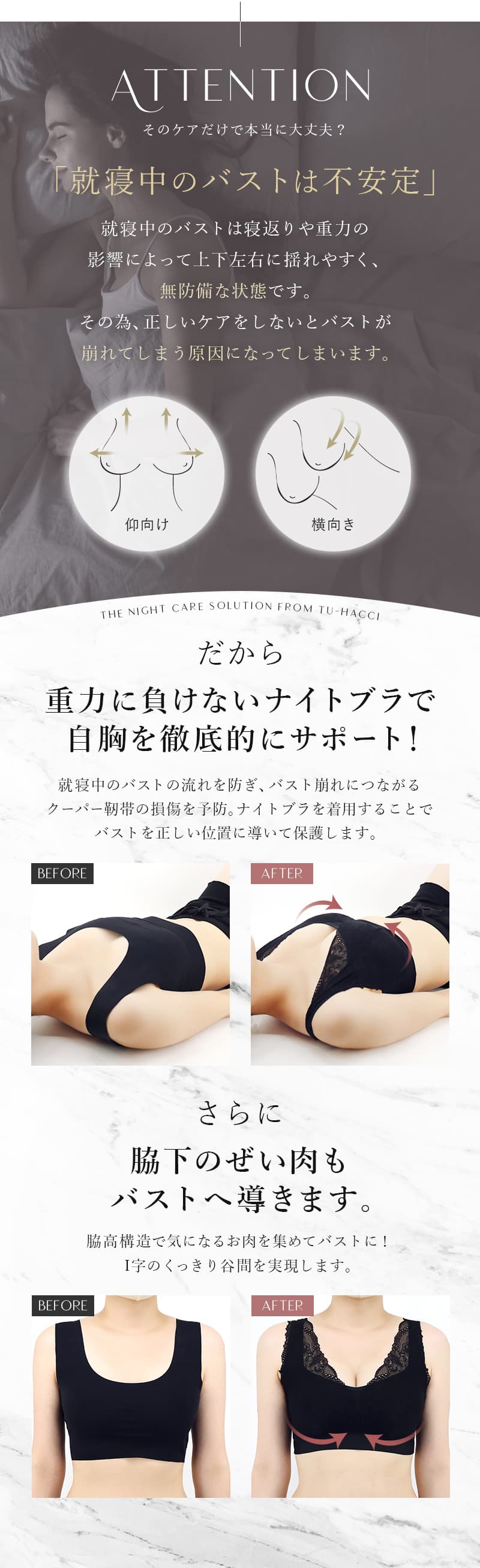 tu-hacci(ツーハッチ)のナイトブラシリーズは、バストの横流れを予防し、理想の位置にキープします。