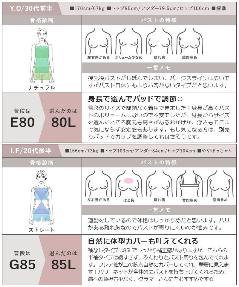 ※届いた商品のアンダーがきついと感じられた場合、製造の過程でまれに内部にしつけ糸が残っている場合がございます。 その場合は、両手でアンダー部分を引き伸ばしてからご着用下さい。 ブチブチとしつけ糸が切れる音がしますが仮縫いの糸のため品質には問題ございません。 ※常に商品改良を行っており、ご購入いただくタイミングにより仕様や着用感が若干異なる場合がございます。