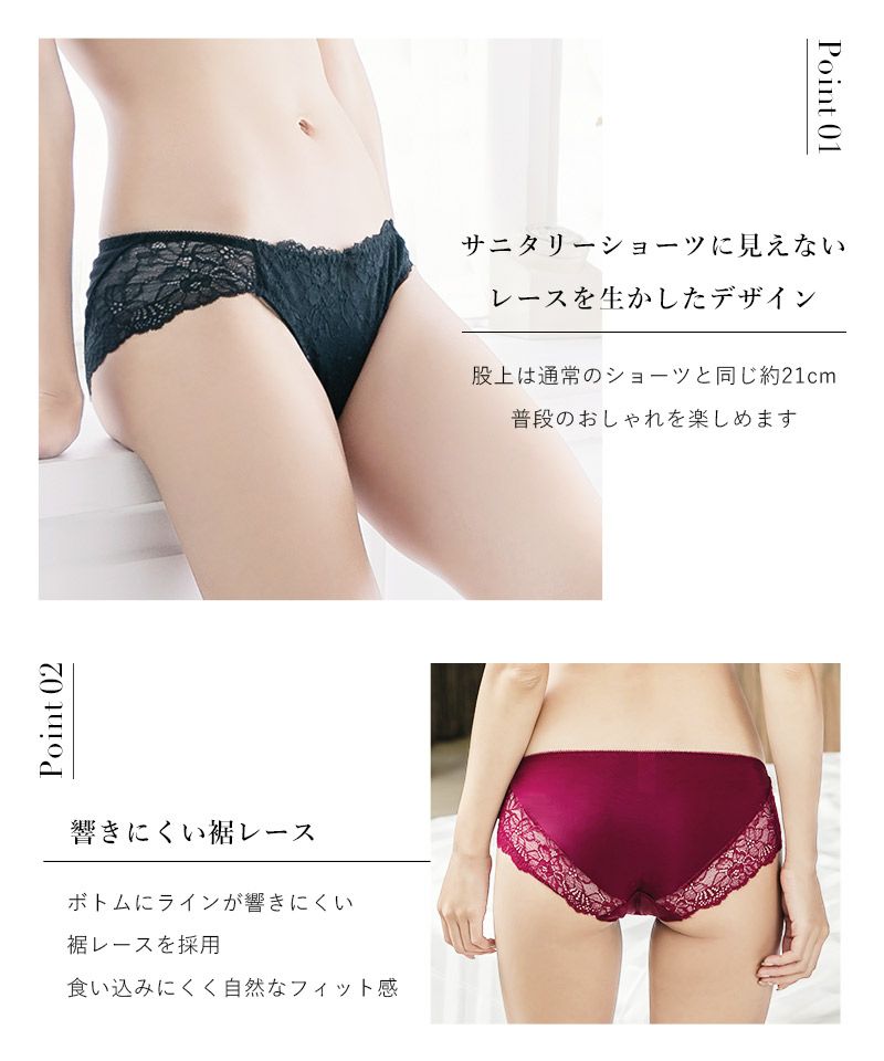 上品な花柄レースと大人っぽいカラーリングがマッチした、クラシカルなサニタリーショーツ。