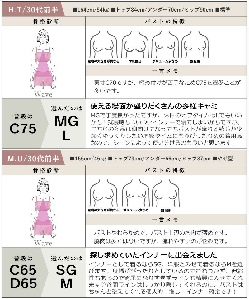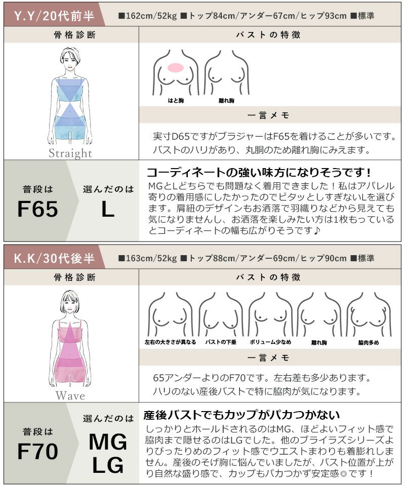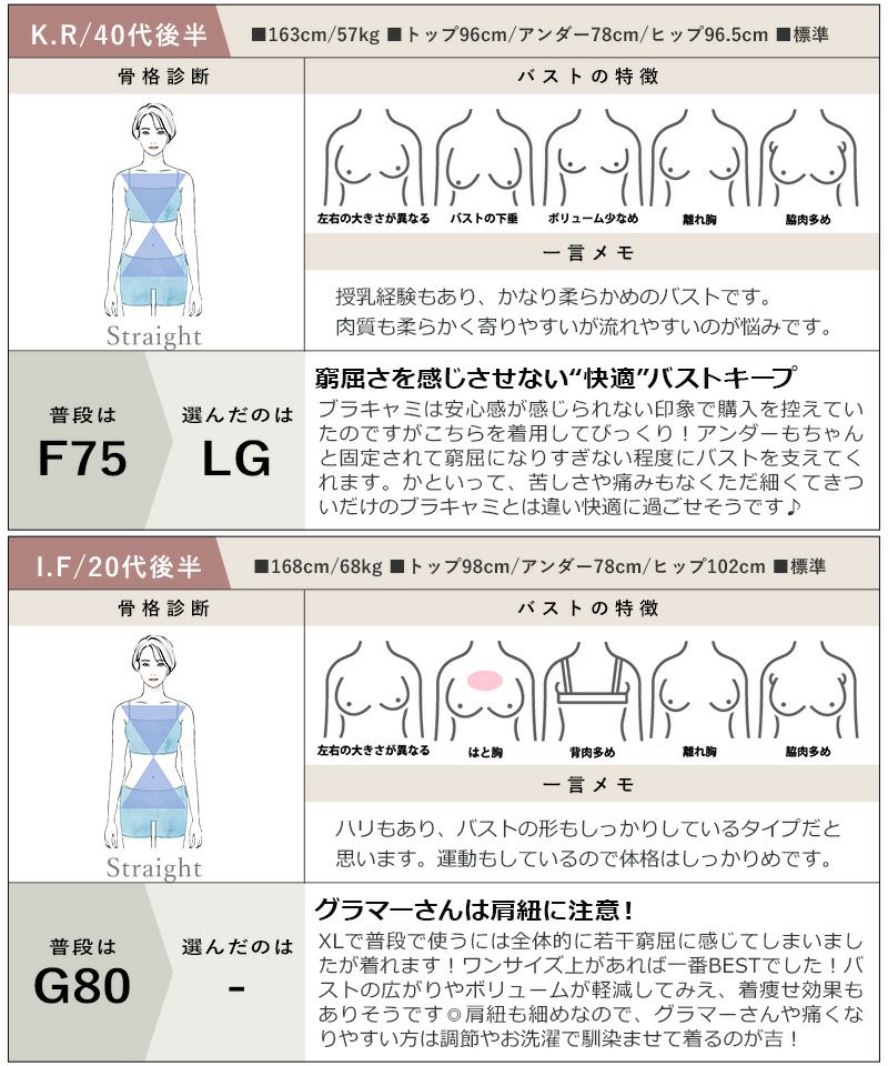 ※本商品は、バストがしっかりホールドされるよう一般的なブラトップよりフィット感が強めの設計です。 ※華奢な方やしっかりめの着用感がお好みの方は普段のサイズを、リラックスして着用したい方や、お肉が気になる方は1~2サイズ大きめをお選び下さい。