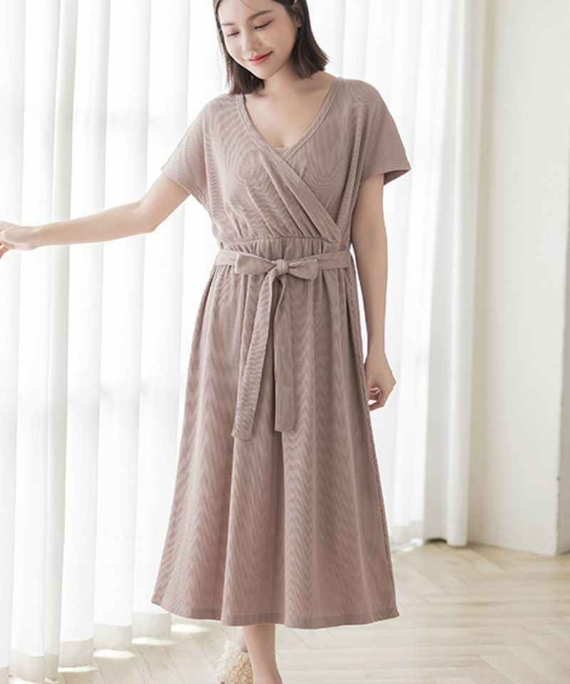 胸元はかなりゆるめだから、授乳期のママはホントに便利だと思う!生地は最初、お風呂上がりは暑いかなと思ったけど、涼しい部屋に行くと丁度良かったです。ノーブラで着ると、トップが分かってしまうので、結局ブラは着けないと着れなかったですが、とにかく可愛いし、着心地がホンットに楽ちんだったので星4です!足元が冷房で冷えるので、丈の長さも良かった。 ただ、リボンは外せるようにもなってたら、良かったかも!