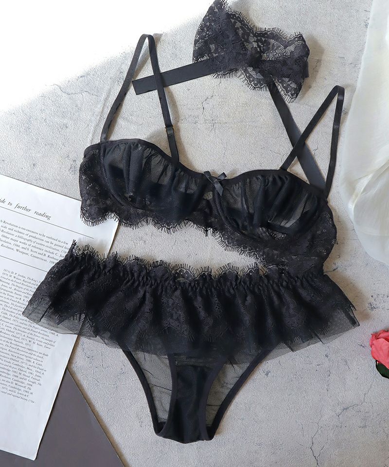 ◇ストラップ取り外し:不可 ◇ストラップ長さ調節:可 ◇ワイヤー:あり ◇パッド:なし ◇ホック:2段3列 ◇素材:ナイロン、スパンデックス、ポリエステル、その他 ◇透け感:あり ◇チョーカー:102.5cm ◇ブラ+ショーツ+チョーカー / 計3点セット