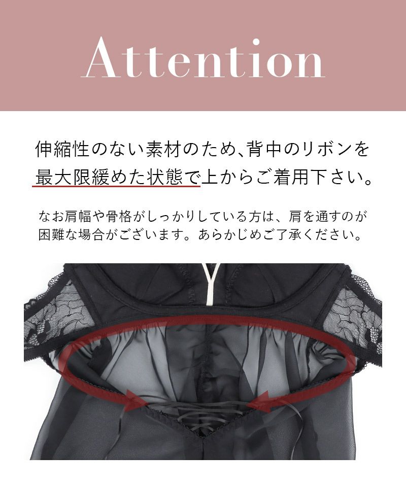 ※伸縮性のない素材のため、背中のリボンを最大限緩めた状態で上からご着用下さい。 なお肩幅や骨格がしっかりしている方は、肩を通すのが困難な場合がございます。 予めご了承ください。
