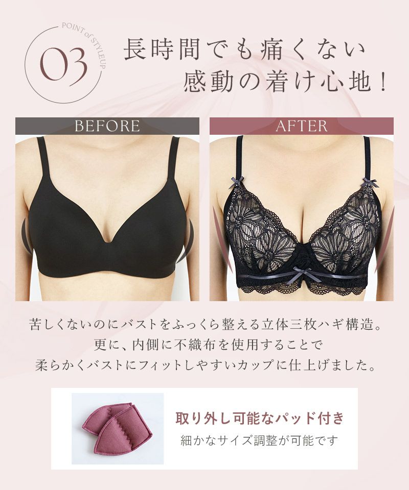 立体三枚ハギ構造でバストを潰さずふっくらリフトアップ。
