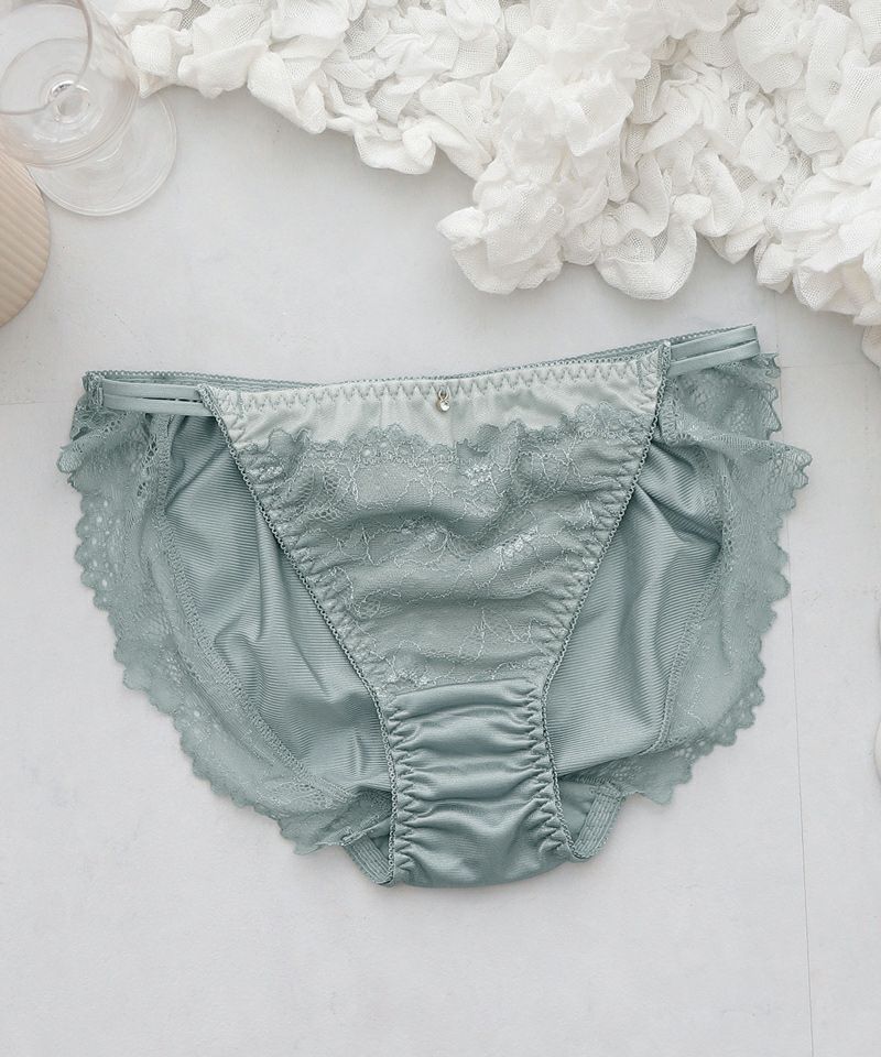 普段使いにぴったりなフルバックショーツながら、繊細なレースとフロントのチャームがさりげないポイントに。