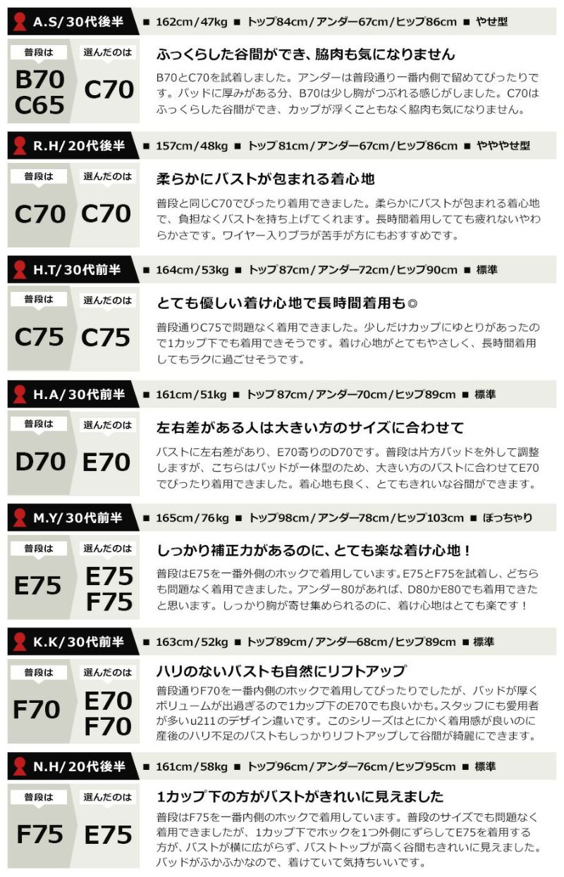 普段通りF70を一番内側のホックで着用してぴったりでしたが、バッドが厚くボリュームが出過ぎるので1カップ下のE70でも良いかも、スタッフにも愛用者が多いu211のデザイン違いです。このシリーズはとにかく着用感が良いのに産後のハリ不足のバストもしっかりリフトアップして谷間が綺麗にできます。