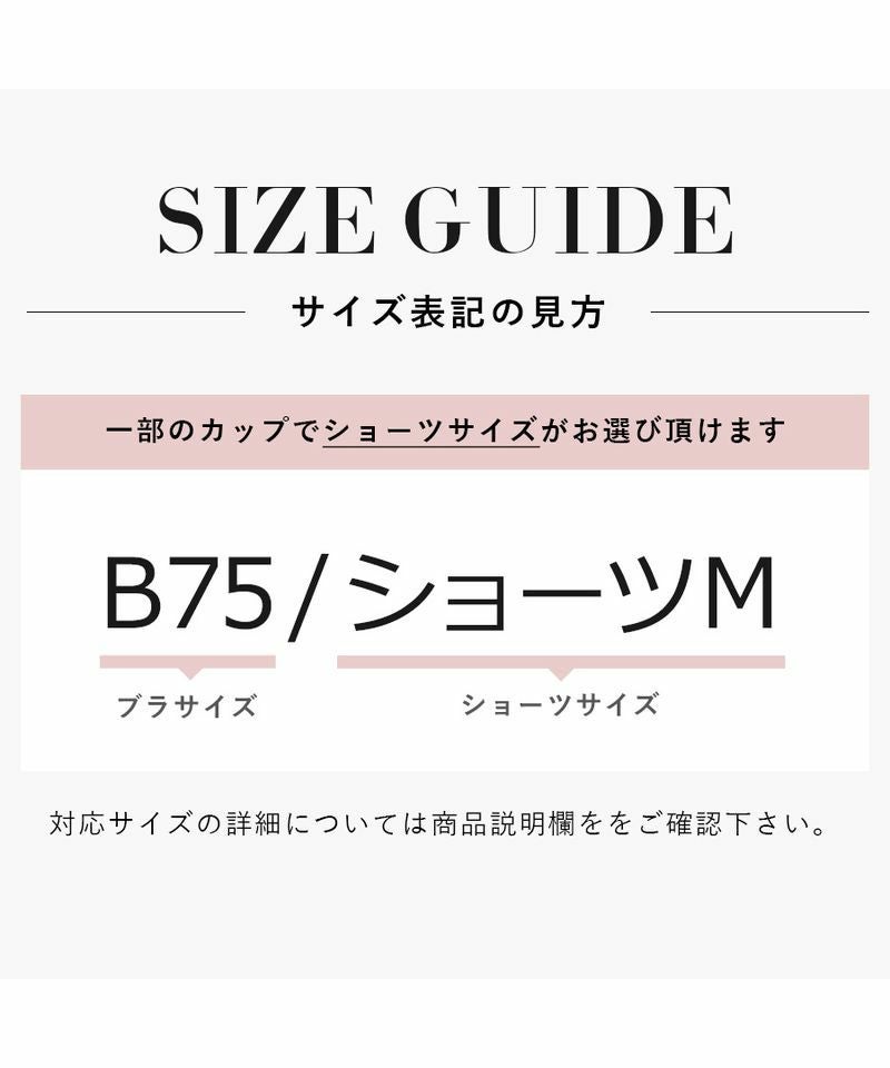 A70/ショーツM A75/ショーツM A75/ショーツL B65/ショーツM B70/ショーツM B75/ショーツM B75/ショーツL C65/ショーツM C70/ショーツM C75/ショーツM C75/ショーツL D65/ショーツM D70/ショーツM D75/ショーツM D75/ショーツL D80/ショーツL ※一部のカップでショーツサイズがお選びいただけます。 上記以外の組み合わせはお選びいただけませんのでご了承ください。