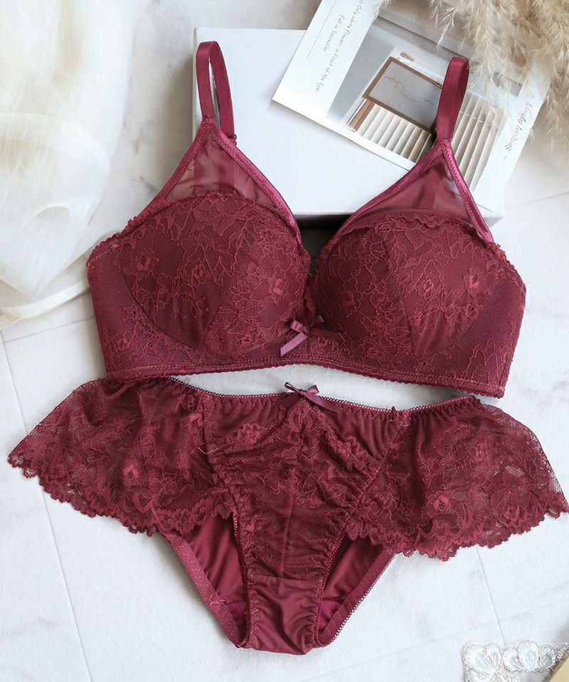 お揃いショーツはサイドにふんわりレースが浮遊する、なめらかな履き心地のフルバックタイプ。
