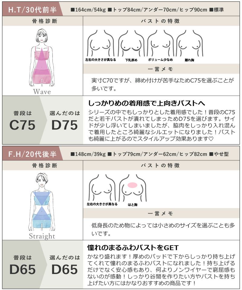 163.5の52.5キロで F65を購入しました! サイズはいつも通りのを頼んで大丈夫だと思います!ワイヤーなしなのに、ホールド力がしっかりあってビックリしました!デザインも可愛くて気に入ってます。また違う可愛いデザインも購入したいです。