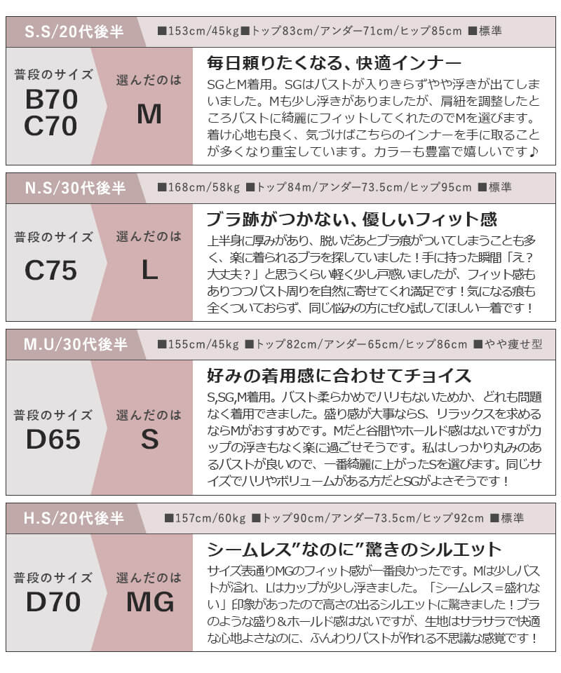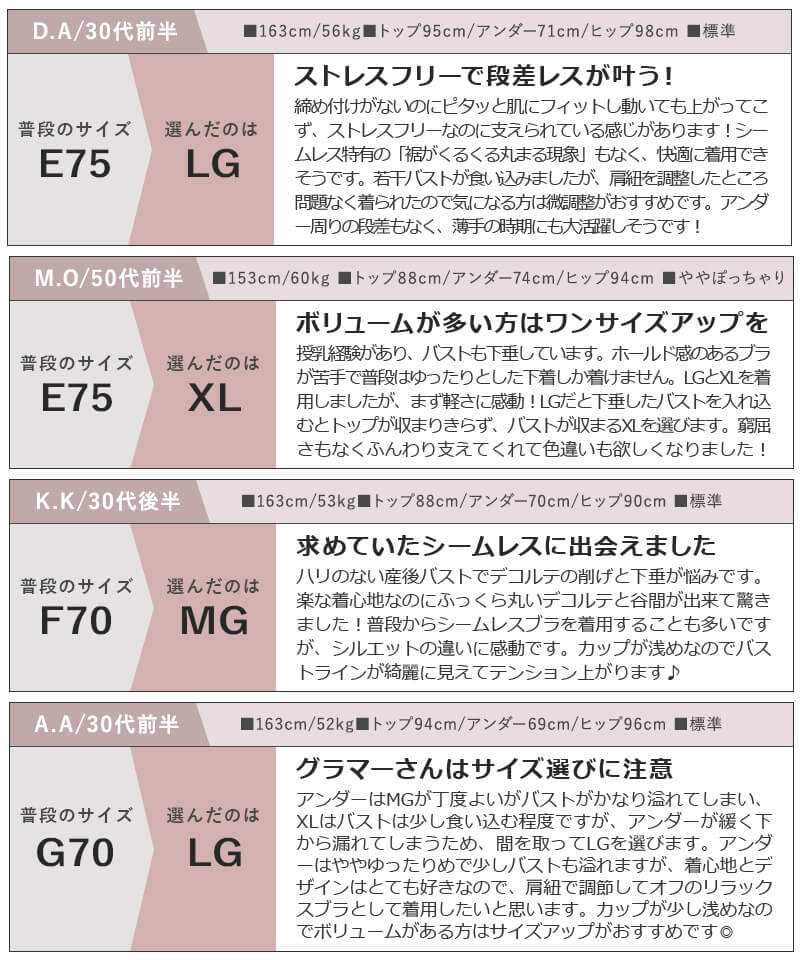 S/ショーツM SG/ショーツM M/ショーツM MG/ショーツM L/ショーツL LG/ショーツL XL/ショーツXL ※「ブラサイズ/ショーツサイズ」となっております。 上記以外の組み合わせはお選びいただけませんのでご了承ください。