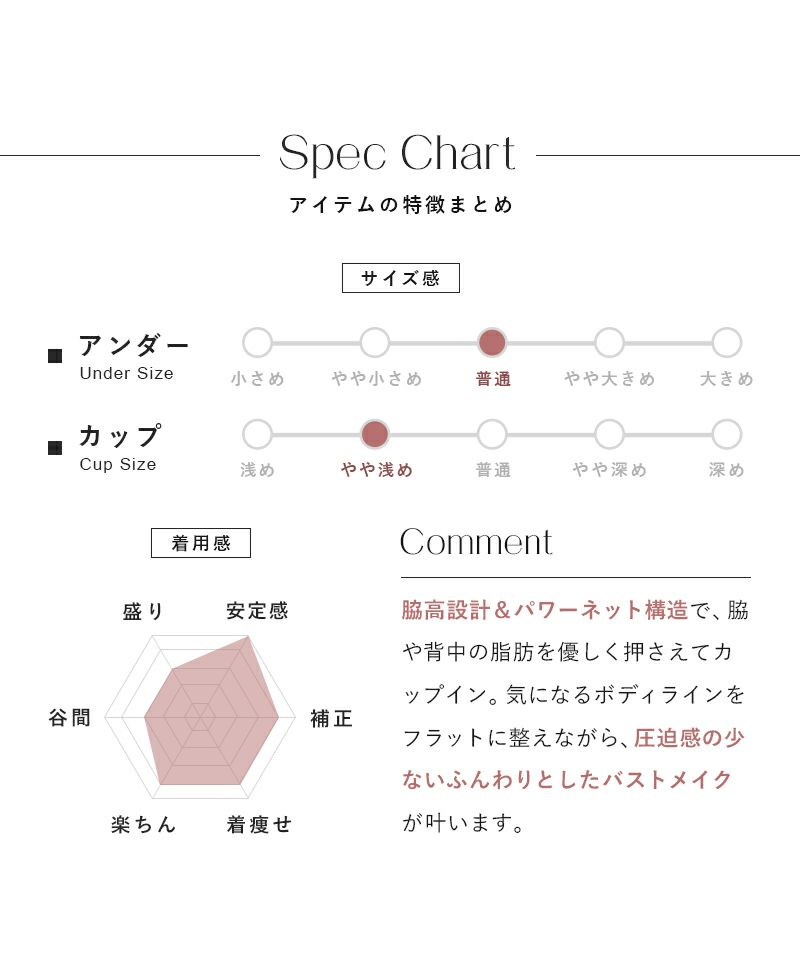 脇高設計&パワーネットで、脇や背中の脂肪を優しく押さえてカップイン。気になるボディラインをフラットに整えながら、圧迫感の少ないふんわりとしたバストメイクが叶います。