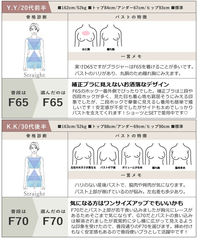 166cm、58キロ普段のサイズはF70で今回もF70を購入しました。限定カラーのピンクの生地にダークグレーのリボンが可愛くて購入しましたが、フィット感がとてもよく気に入ったので次は色違いも購入しようと思います!ショーツも可愛いのでおすすめです!