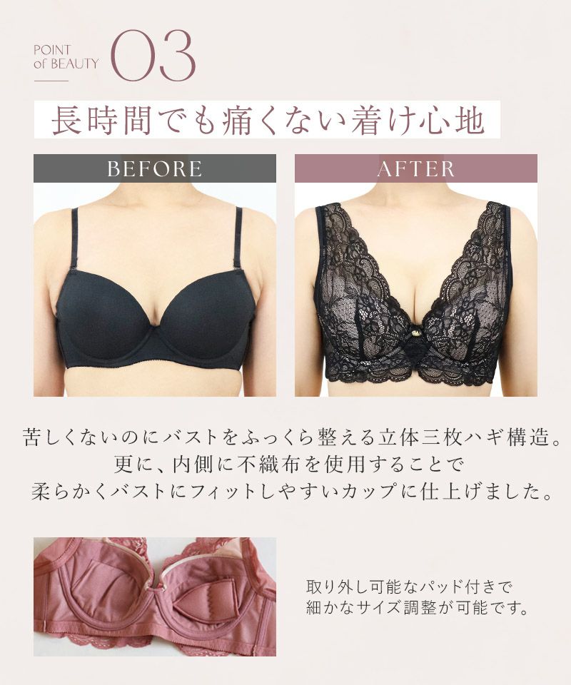 立体三枚ハギ構造でバストを潰さずふっくらリフトアップ。
