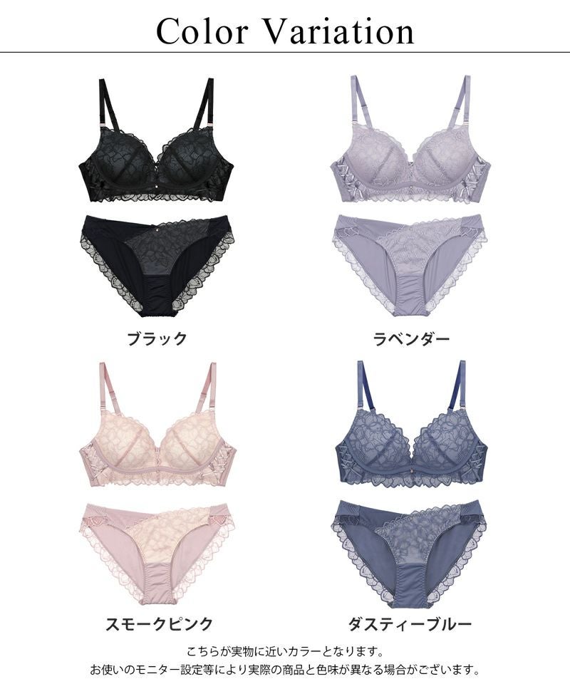 ストラップ取り外し:不可 ストラップ長さ調節:可 パッド:あり(内蔵型) パッド取り外し:不可 ワイヤー:なし ホック:2段3列 ホック(Hカップ):3段3列 ブラジャー透け感:なし ショーツ透け感:Bタイプショーツは透け感あり 素材:ナイロン・ポリウレタン ブラ&ショーツ / 計2点セット