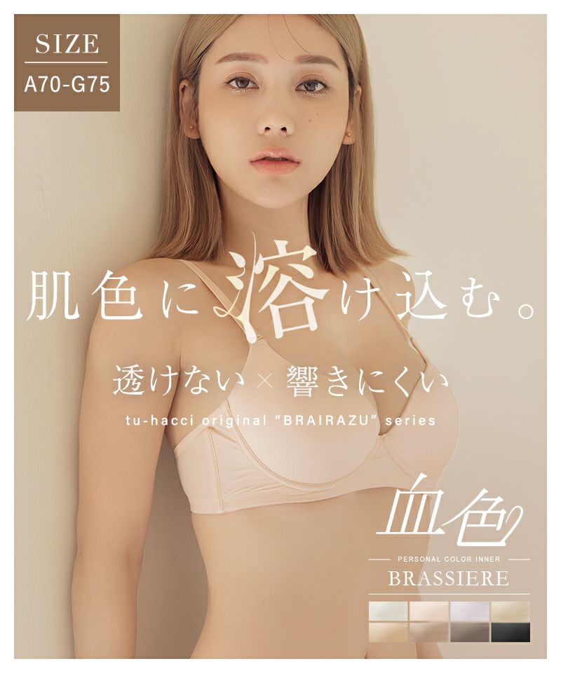 E80だと少しバストが溢れてしまい、F80でカップにしっかりおさまりました!カラー診断はイエベ秋で、ブラウンが一番肌が綺麗に見えました。白Tシャツで一番透けないのはヌードベージュです。透けにくい色と肌馴染みが良いカラー等、印象を変えられるのも嬉しいポイントです!