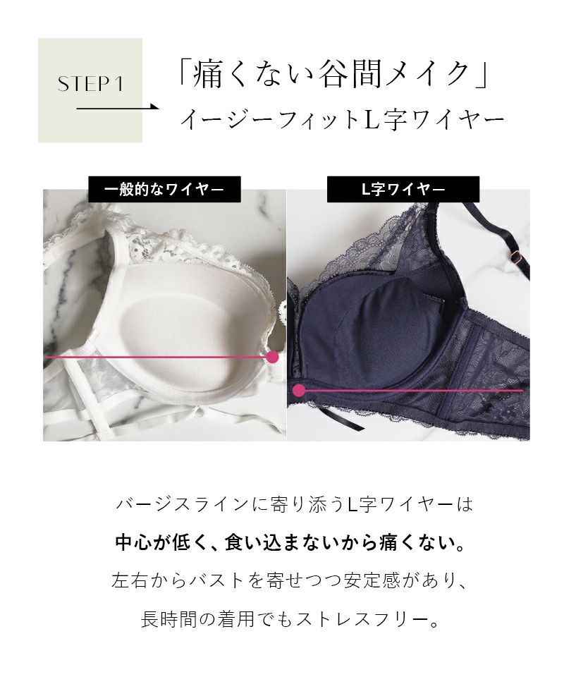 しっかりめの作りでしたが問題なく着用できました。脇の部分のカップが浮きやすく気になりましたが、ストラップの調節をしっかり行うことで改善されました。補正力が強く、谷間がかなりくっきりとできたため良い感じにメリハリができて綺麗にみえます。