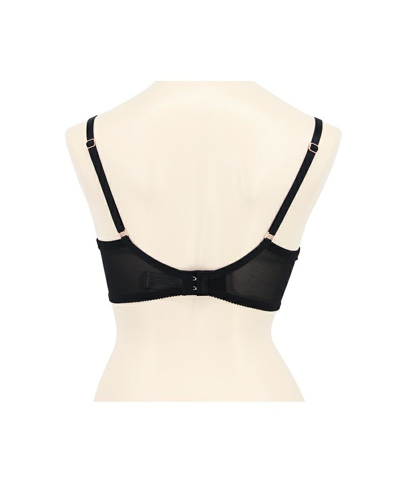 採寸結果はC70ですが、アンダーの締め付けが苦手で普段はC75を着用しています。こちらのブラはワイヤーがしっかりしており、胸の形を1日中キープしてくれそうな安心感がありました。C75を真ん中のホックで留めてぴったり着用できました。