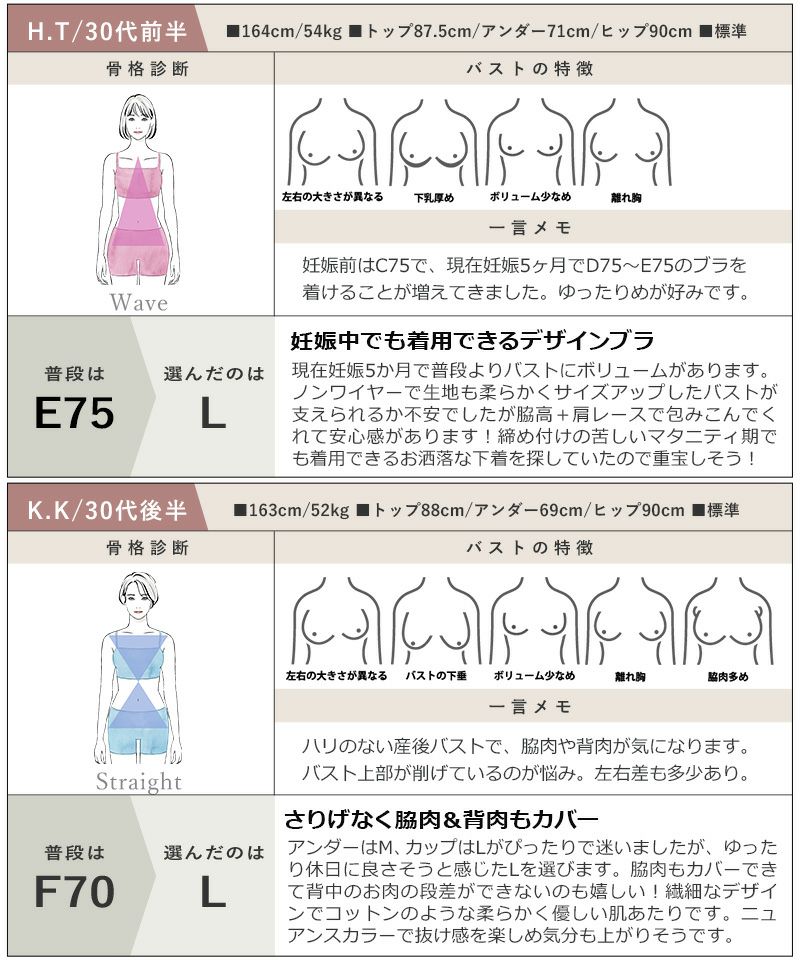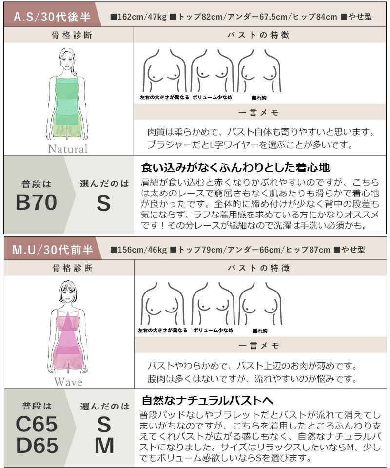 ※サイズは目安となります。体型、バストの質感、着用感の好みによっても個人差がございますので予めご了承ください。
