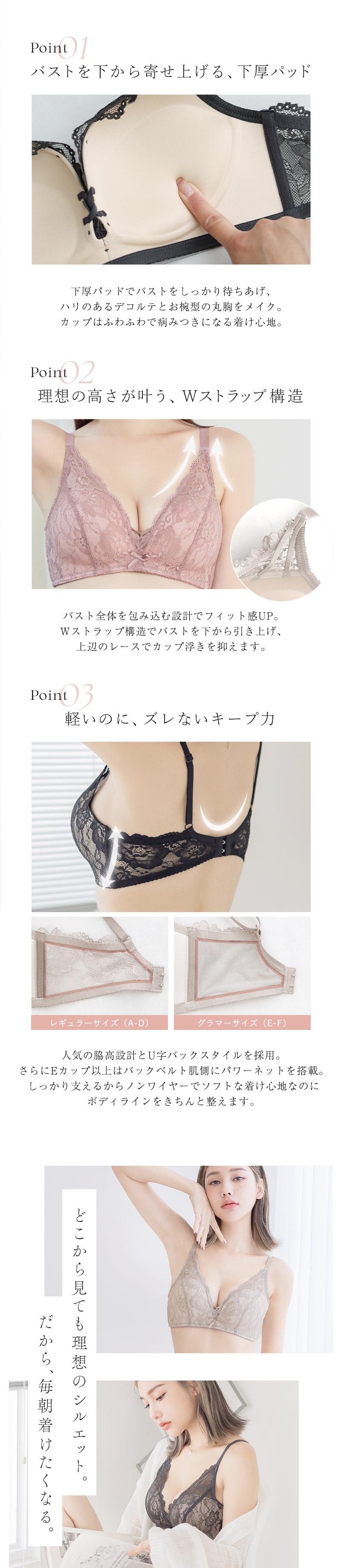 ストラップ取り外し:不可 ストラップ長さ調節:可 パッド:有(内蔵型) パッド取り外し:不可 ワイヤー:無 ホック:2段3列 透け感:若干あり 素材:ナイロン・ポリウレタン ブラジャー単品 ※こちらの商品は2025年5月にリニューアルいたしました。これ以前のレビューはリニューアル前の商品に対するものとなりますので、ご参考の際はご注意ください。 ※常に商品改良を行っており、ご購入いただくタイミングにより仕様や着用感・色味が若干異なる場合がございます。