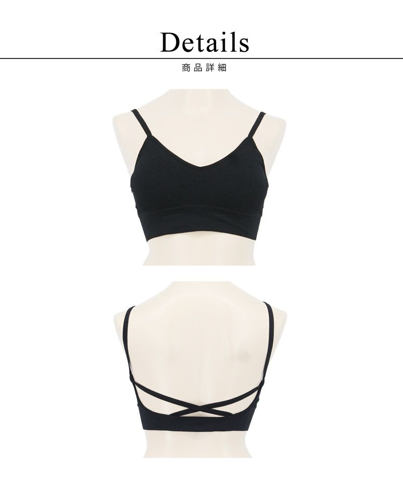 ストラップ取り外し:不可 ストラップ長さ調節:不可 パッド:あり パッド取り外し:可 ワイヤー:なし ホック: なし 透け感:なし 素材:ナイロン、スパンデックス ブラ単品