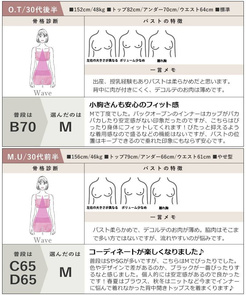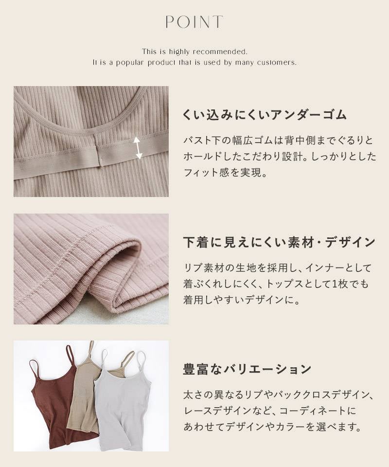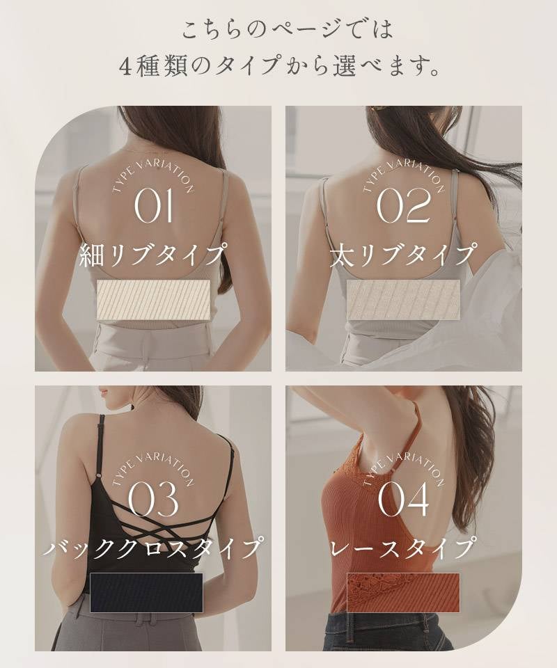 当店のバックオープンタイプやリブ素材のものは、あえて見せるインナーとしてデザインされています。下着感のない素材を選んでいただくことで、トレンドの背中見せコーデもスタイリッシュに楽しめます。