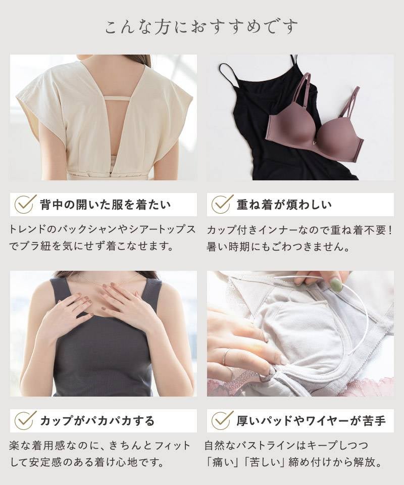 ノンワイヤーで締めつけ感が少ないタイプ【 《Basic ナチュラル》「ブラモネ」リブタンクトップ U型 など】がおすすめです。