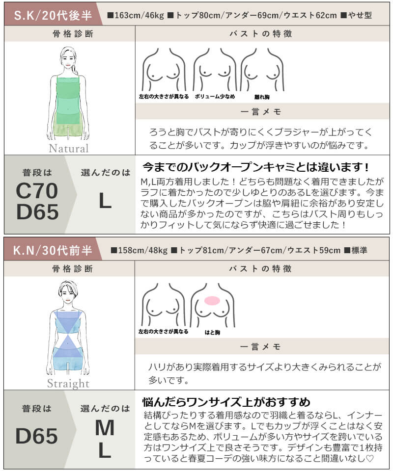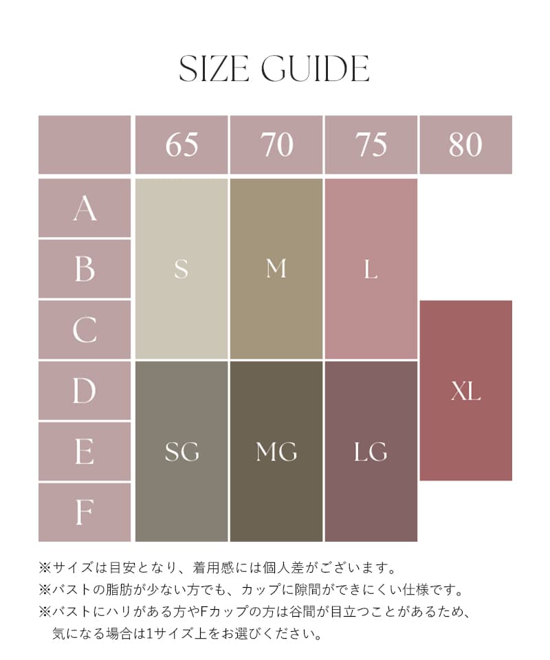 基本的にはブラジャーのサイズ表に準じますが、ブラトップはアンダーの締め付けを緩和するために設計されています。より安定感を求めるなら「ジャストサイズ」、リラックス感を優先するなら「ワンサイズ上」が目安です。
