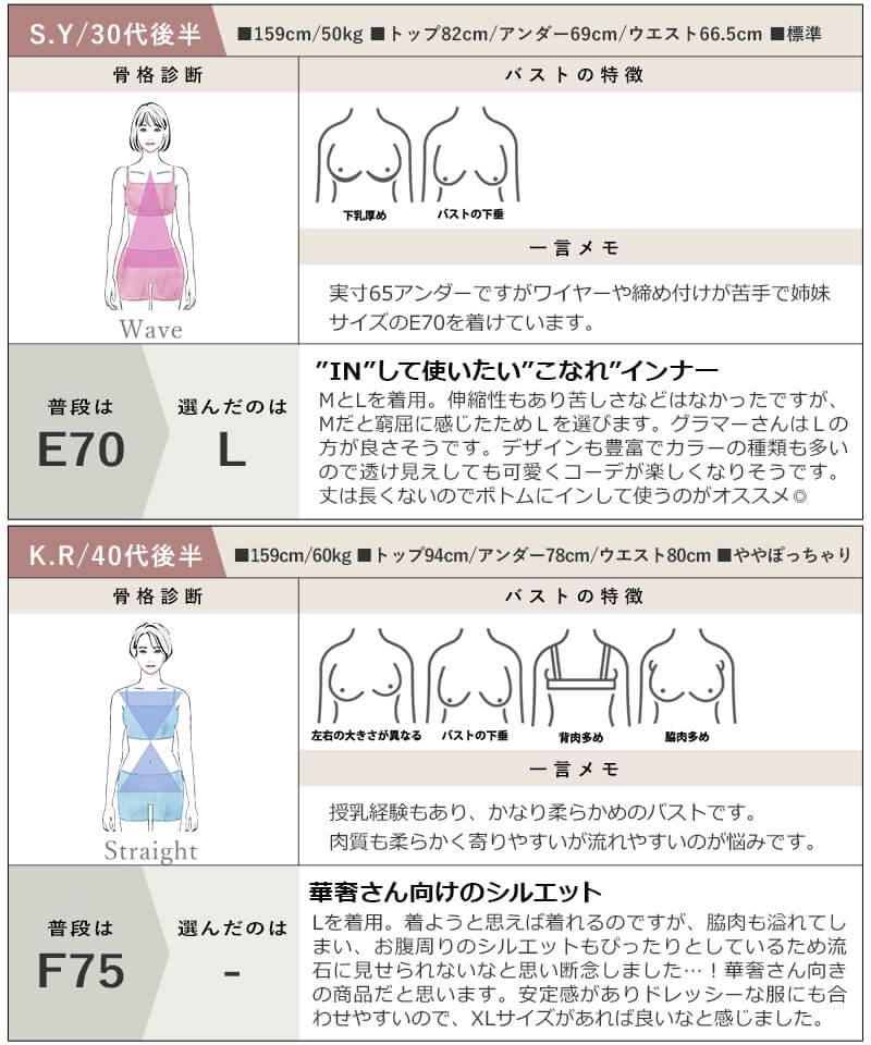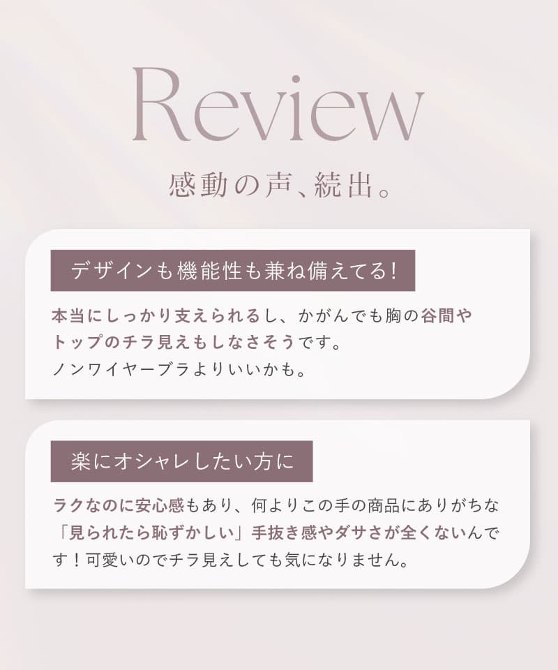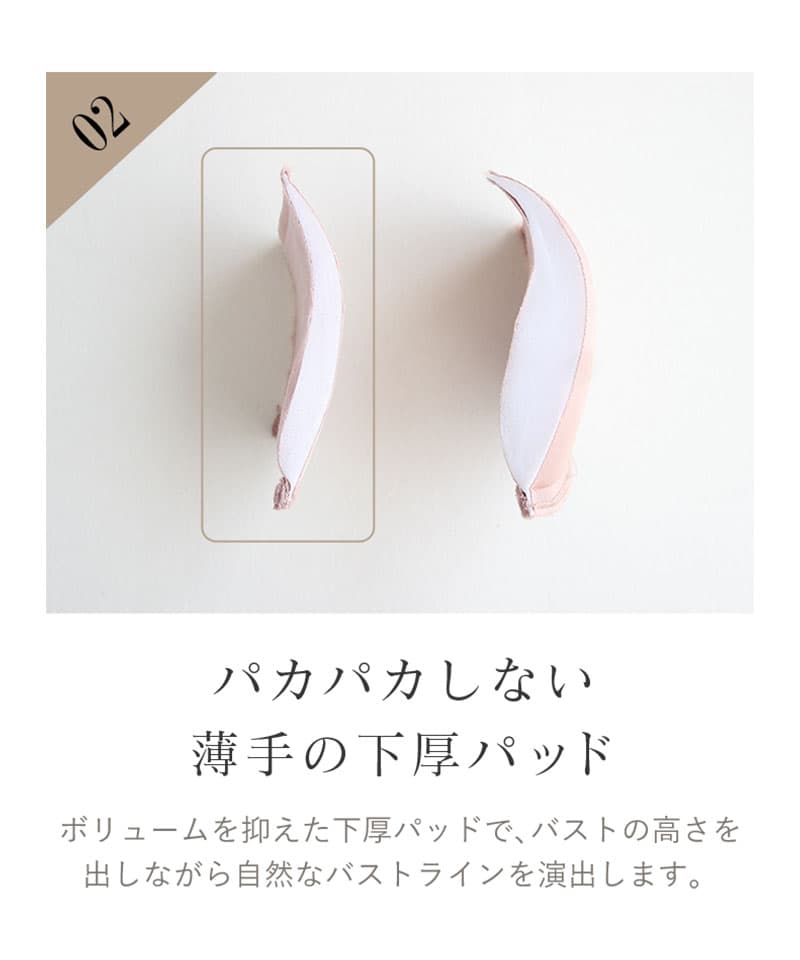 アンダー部分にパワーネットや強めのゴムを配した「ホールド力重視」のタイプがございます。ノンワイヤーでも下からしっかり支える構造により、ブラジャーに近い上向きのシルエットを作ることが可能です。