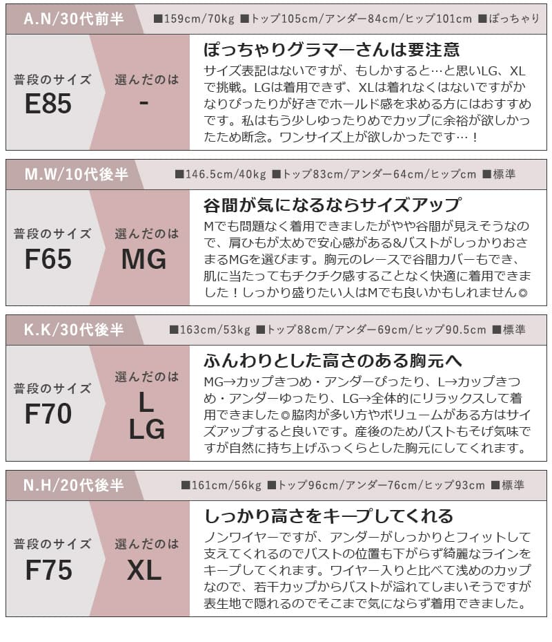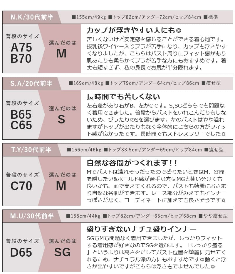 ※ワイヤー入りタイプとは対応サイズが異なります。 本商品はノンワイヤーでもバストを寄せ上げ出来る構造となっており、バストに脂肪が少ない方でもカップに隙間ができにくいのが特徴です。 カップの構造上、バストにハリがある方、Fカップの方は谷間が目立つ場合がございます。気になる方は1サイズ上をお選びください。