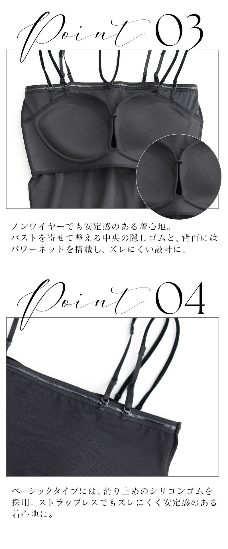 ストラップ取り外し:ベーシックタイプのみ可 ストラップ長さ調節:可 パッド取り外し:不可 ワイヤー:なし 素材:ポリエステル、ポリウレタン、その他 キャミソール単品 ※商品のバーコードシールに印字されている表記が 一部商品ページの表記と異なる場合がございます。下記をご参照の上、予めご了承下さい。 ベーシックタイプ:「2WAY」 ロンパースタイプ:「ボディスーツ風」