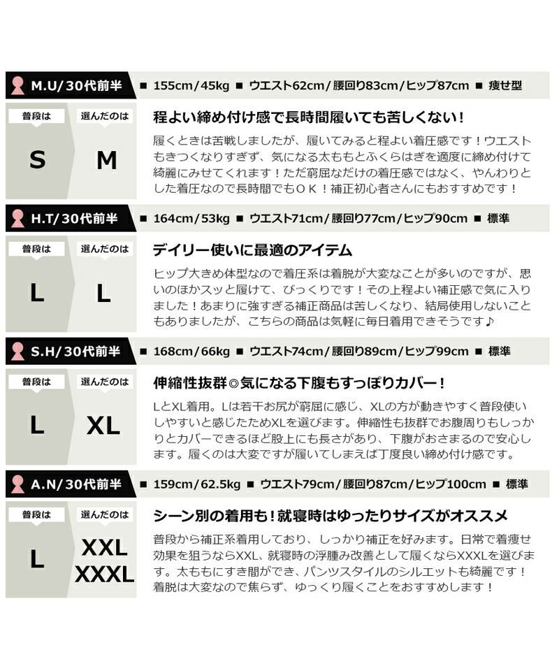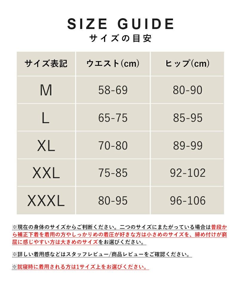 ※現在の身体のサイズからご判断ください。 2つのサイズにまたがっている場合は、普段から補正下着を着用の方やしっかりめの着圧がお好きな方は小さめのサイズを、締め付けが苦手な方は大きめサイズをおすすめします。 ※就寝時に着用される方は1サイズ上がおすすめです。