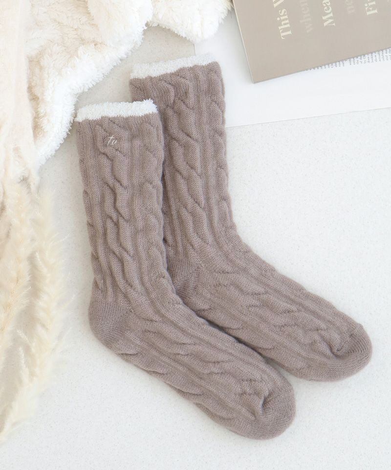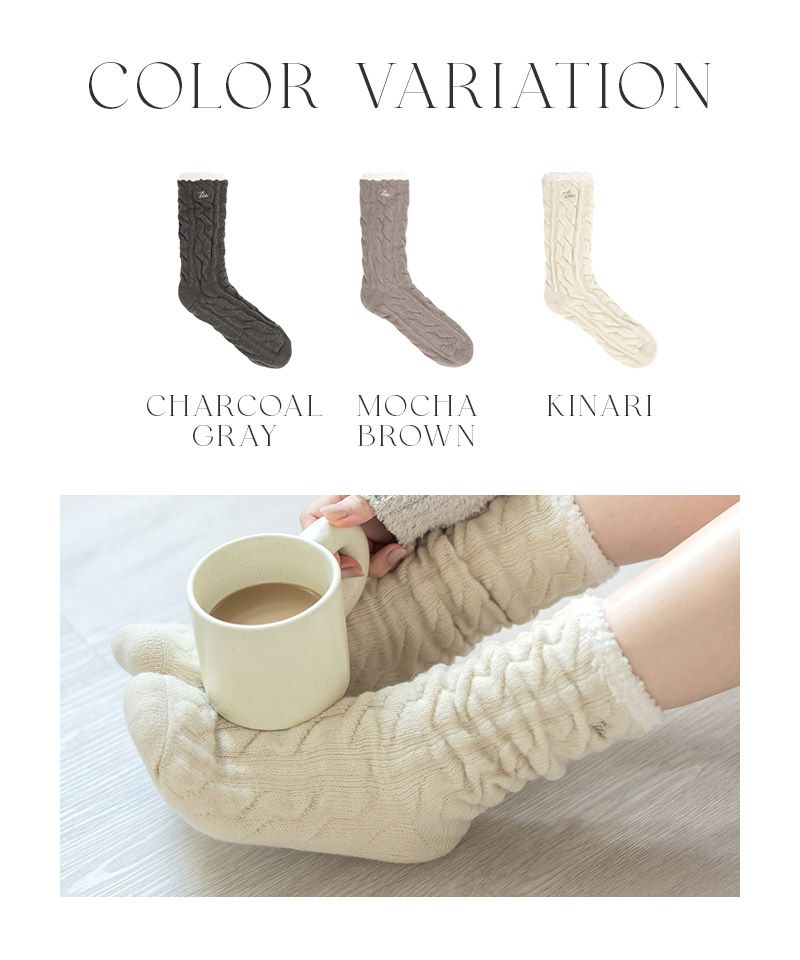 ボアとケーブル編みの毛糸の二層構造が冷えやすい足元をしっかり包み込み、温かさをずっとキープ。