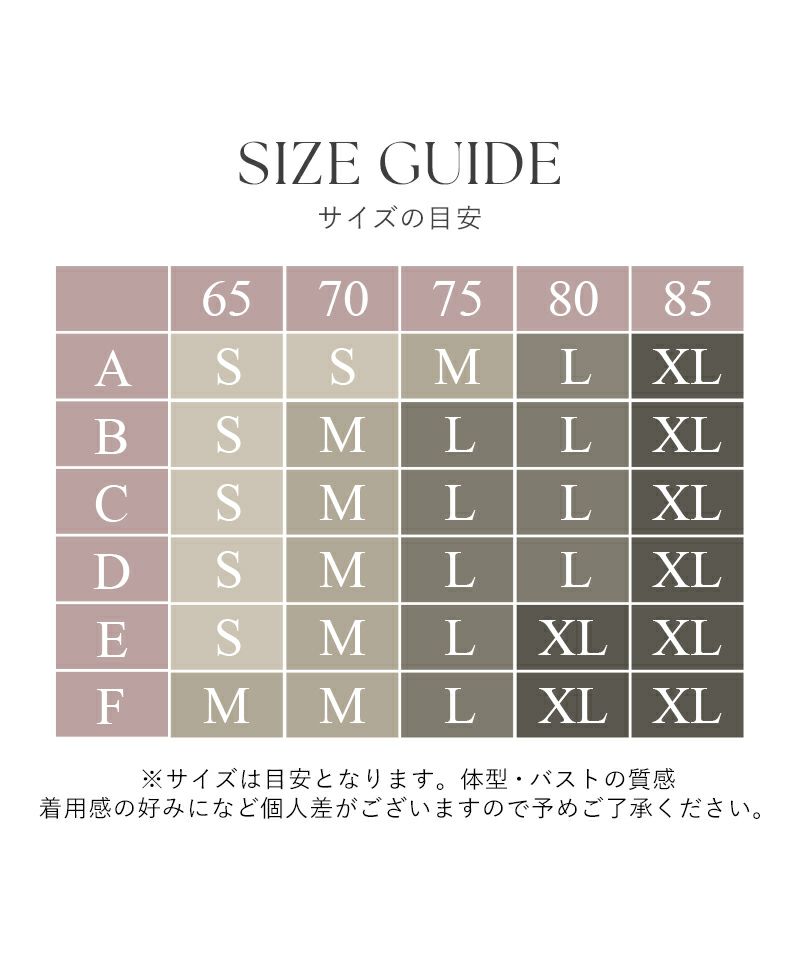 ※サイズは目安となります。体型、バストの質感、着用感の好みによっても個人差がございますので予めご了承ください。