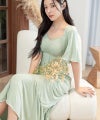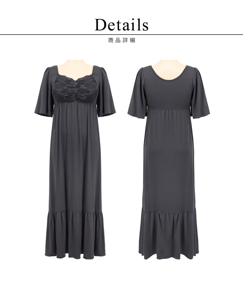 胸下からふんわりと広がるAラインでお腹周りもゆったりしているため、体型カバーしたい方やマタニティワンピとしても。