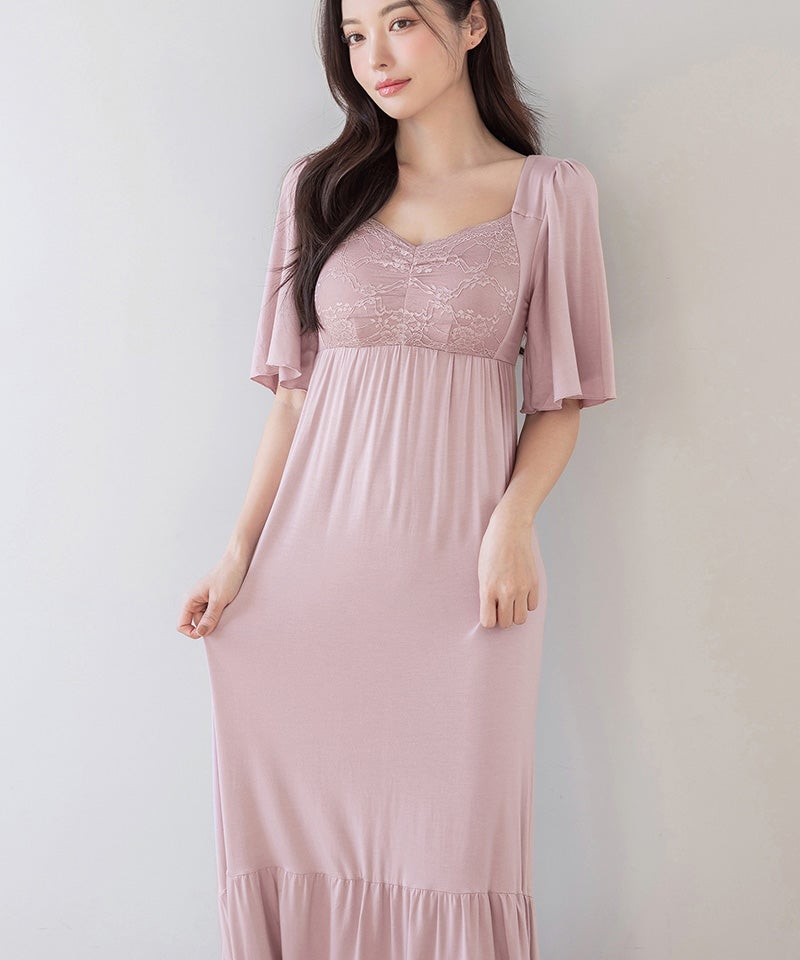 《ラクシアスリープ》ナイトブラワンピース 半袖ロング丈 無地/花柄