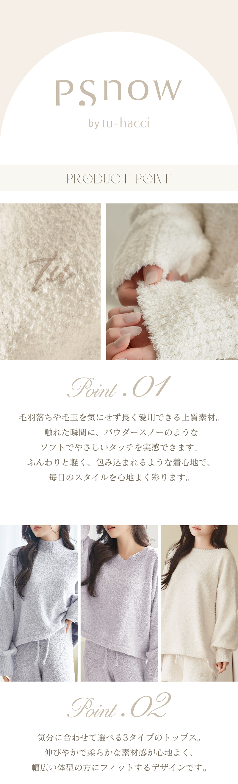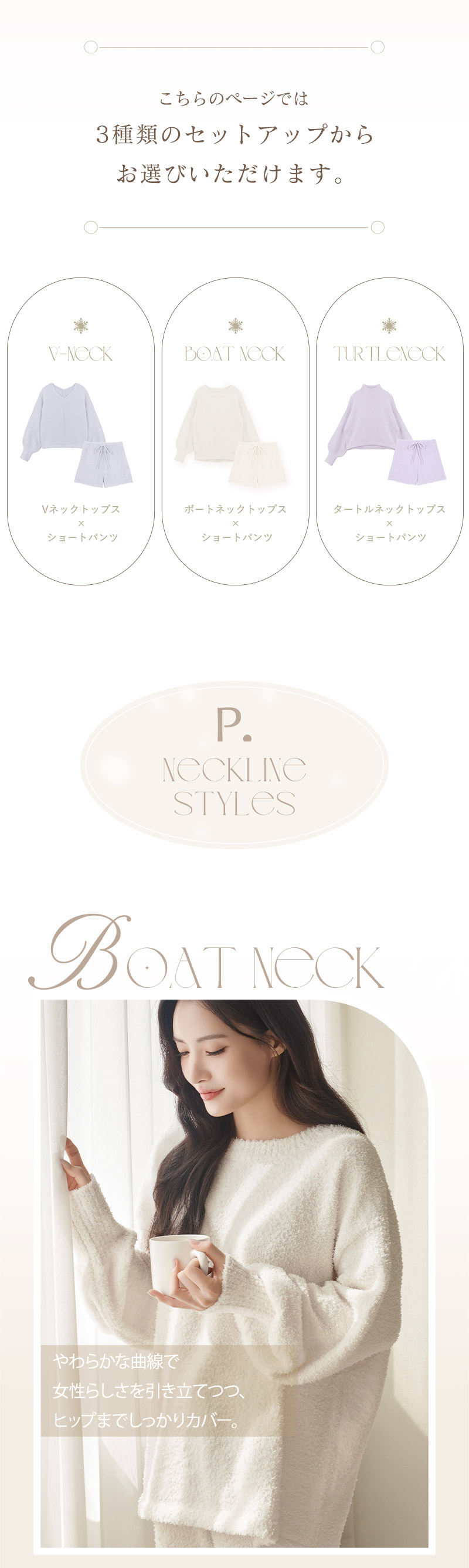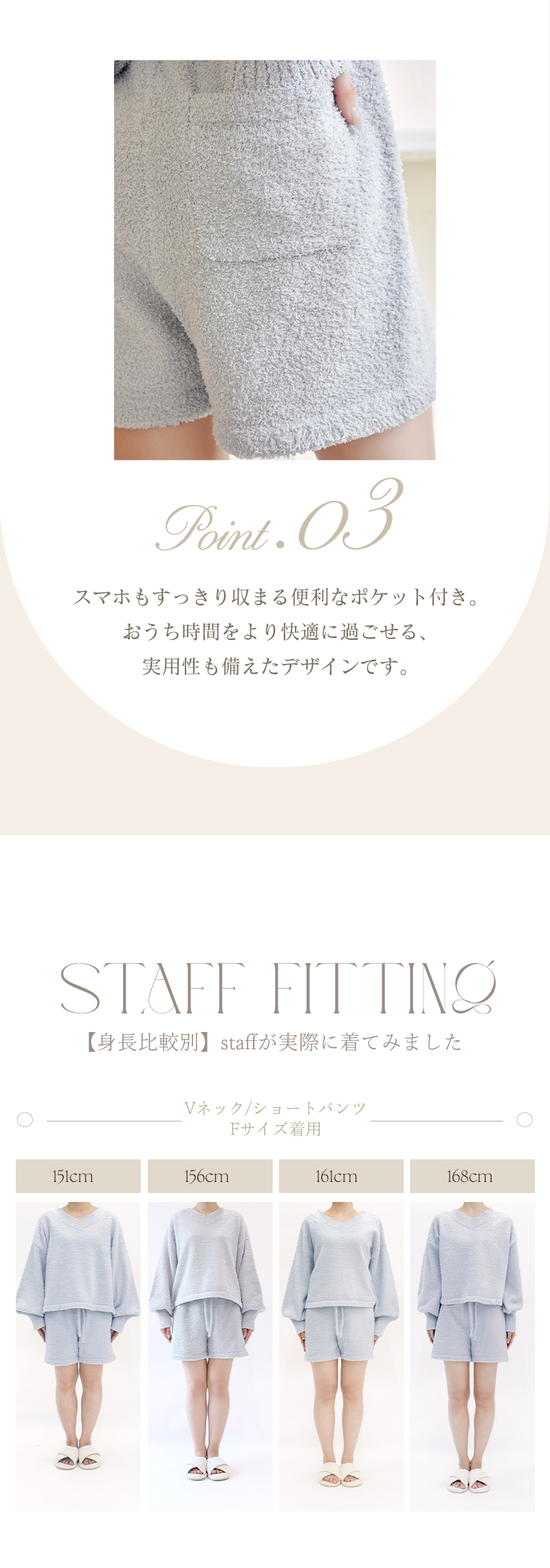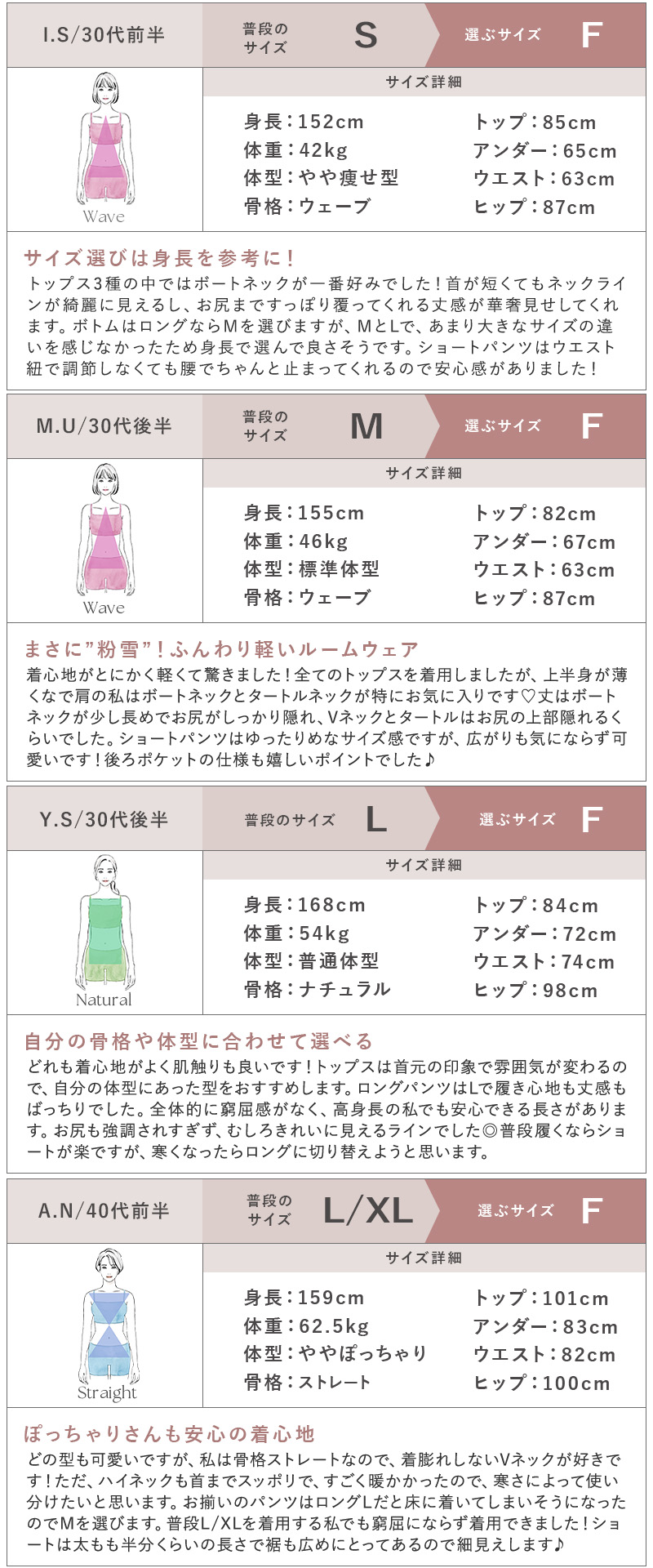 【トップス】 タートルネック 着丈(前):50cm、身幅:62cm、裾幅:62cm、袖丈:51cm、首幅:21.5cm Vネック 着丈(前):55cm、身幅:62cm、裾幅:60cm、袖丈:51cm Uネック 着丈(前):65cm、身幅:62cm、裾幅:60cm、袖丈:51cm 【ショートパンツ】 ウエスト:34cm、着丈:38cm、股下:9cm、裾幅:30cm ※平置きサイズはスタッフが採寸した実寸値となり、若干の誤差が生じる場合がございます。 ※対応身長は目安となり、実際の着用感には個人差がございます。 ※当商品には伸縮性がございます。