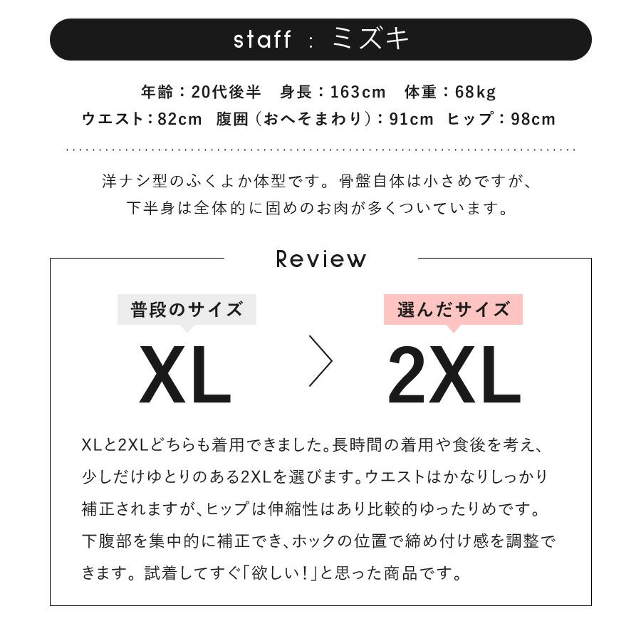 お腹がスッキリ見えてとっても良かった!布の薄いスカートだとホックがちょっと透けて影響するけど厚めのワンピースとかはバッチリです!