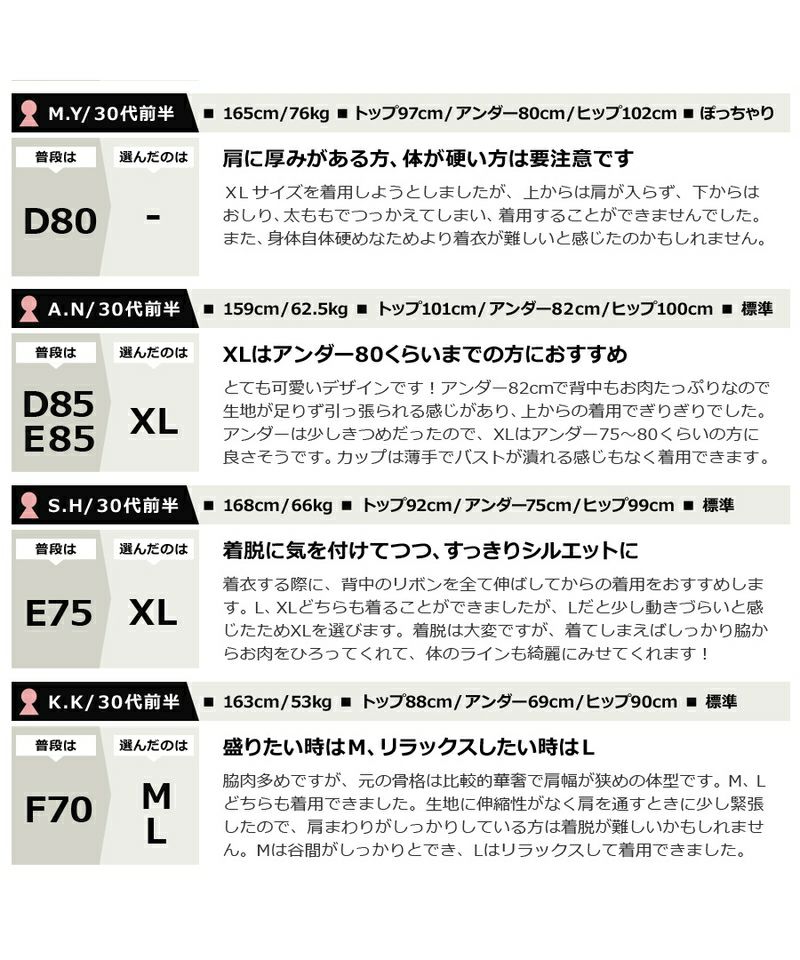 ※伸縮性のない素材のため、背中のリボンを最大限緩めた状態で上からご着用下さい。 なお肩幅や骨格がしっかりしている方は、肩を通すのが困難な場合がございます。 予めご了承ください。