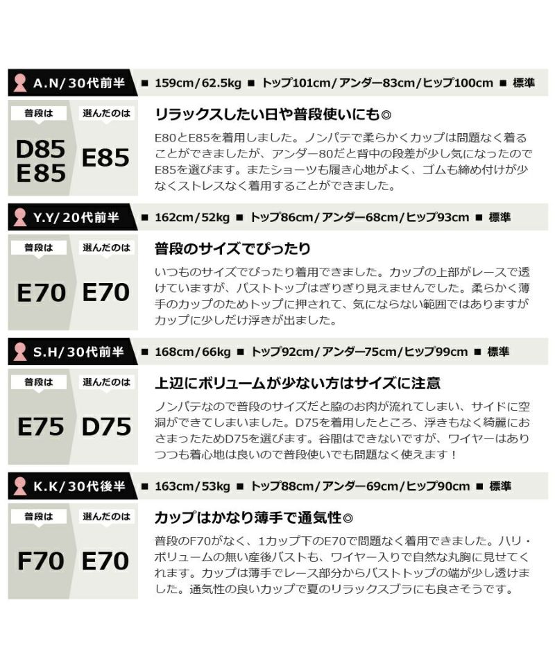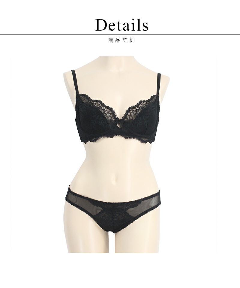 ストラップ取り外し:不可 ストラップ長さ調節:可 ワイヤー:有 パッド:無 ホック:2段3列 素材:ナイロン・スパンデックス・その他 ブラ透け感:若干あり ショーツ透け感:あり ブラ+ショーツ / 計2点セット
