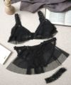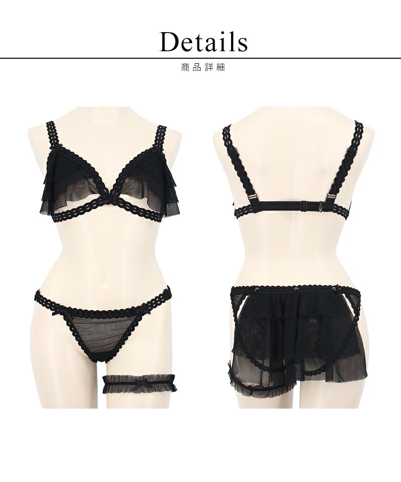 ストラップ取り外し:不可 ストラップ長さ調節:可 ワイヤー:なし パッド:なし ホック:あり(フックタイプ) 素材:ナイロン・ポリエステル・その他 透け感:あり ブラ+ショーツ+ガーターリング/ 計3点セット