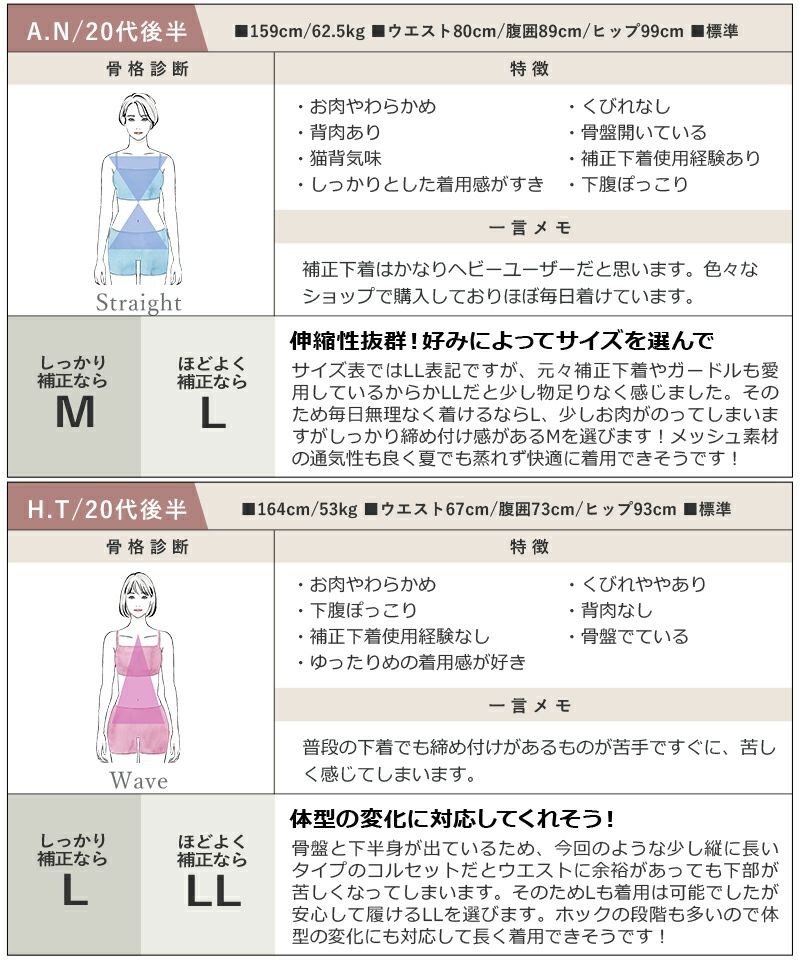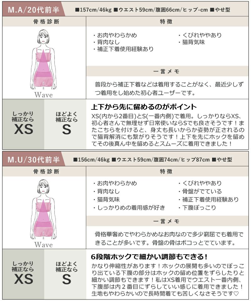 ※体型や着用感の好みにより、サイズ感には個人差がございます。 あくまでも目安となりますので、補正下着に慣れていない方は大きめを、しっかりとくびれを作りたい方は小さめをお選び下さい。