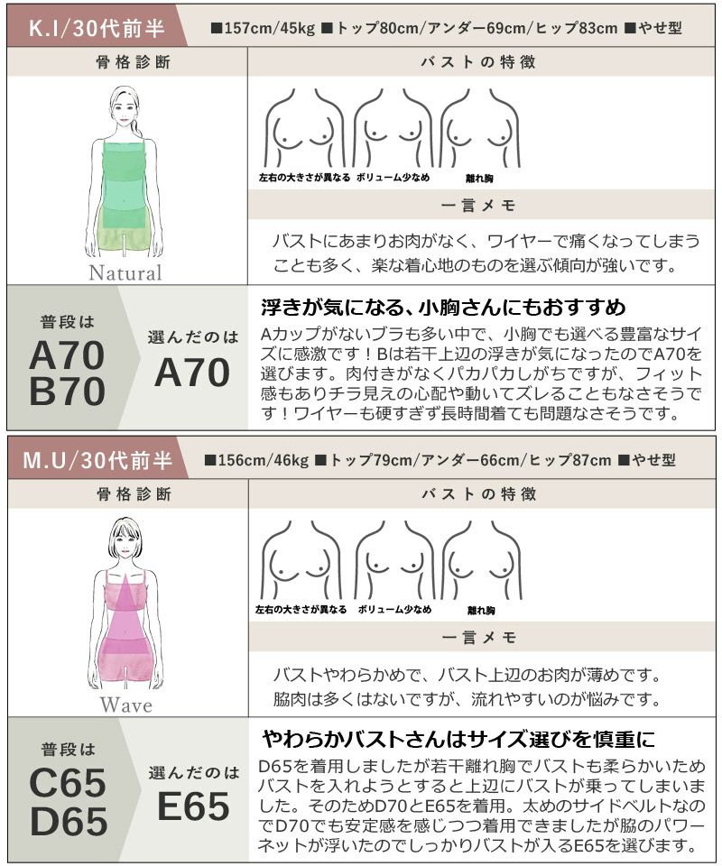 152㎝50キロの普通体型 普段はF70かG65を着用 今回はG65を購入しました。 アンダーはピッタリなのですが、カップが浅めのためパットを外しても少しきついです。 パットで調節できるのでワンカップ上げるのをお勧めします! デザインや色味は本当に可愛くて、写真より少しピンクが濃いめかなと思いました。黒×ピンク最強です。