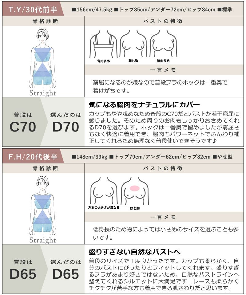166cm、58キロ普段のサイズはF70で今回もF70を購入しました。限定カラーのピンクの生地にダークグレーのリボンが可愛くて購入しましたが、フィット感がとてもよく気に入ったので次は色違いも購入しようと思います!ショーツも可愛いのでおすすめです!